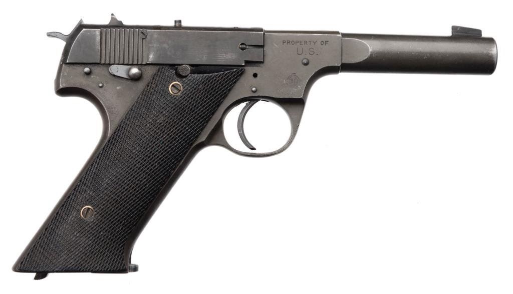 *Hi-Standard U.S.A. Model H-D semi-automatic  pistol, “PROPERTY OF U.S.”-marked on right  front side of frame; .22LR caliber, 4.5”  barrel, S/N 118681, mat black finish,  checkered grips, in overall very good to near  fine condition with fine bore and crisp  action.    Est.:  $700-$1,400.