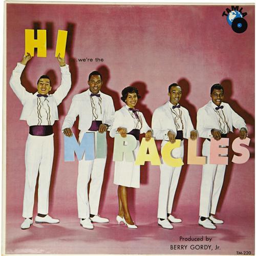 <B>"Hi! We're The Miracles" LP Tamla 220 (1961).</B></I> The classic Motown group's first release was initially released in 1961 with a white Tamla label. The more famous yellow Tamla label came later with a 1962 pressing. This one's the original white label, and our copy's condition is hard to beat! There is a "#5" stamp on the back cover. Condition: NM 8/ NM 8.