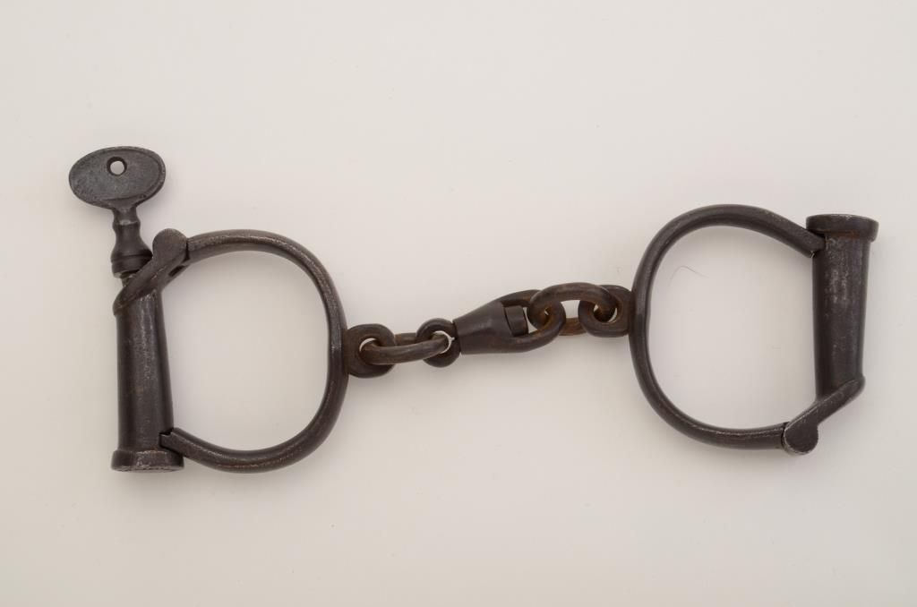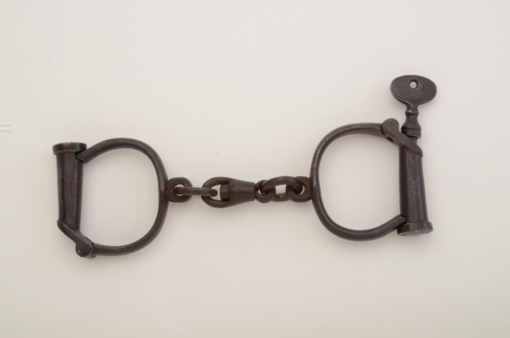 Hiatt Darby handcuffs, dark patina, with key marked “13”, in working order at time of description, circa late 1800’s in overall good condition. From an old collection. Est.: $200-$300.