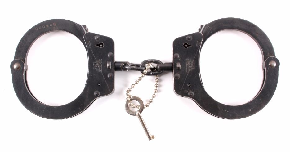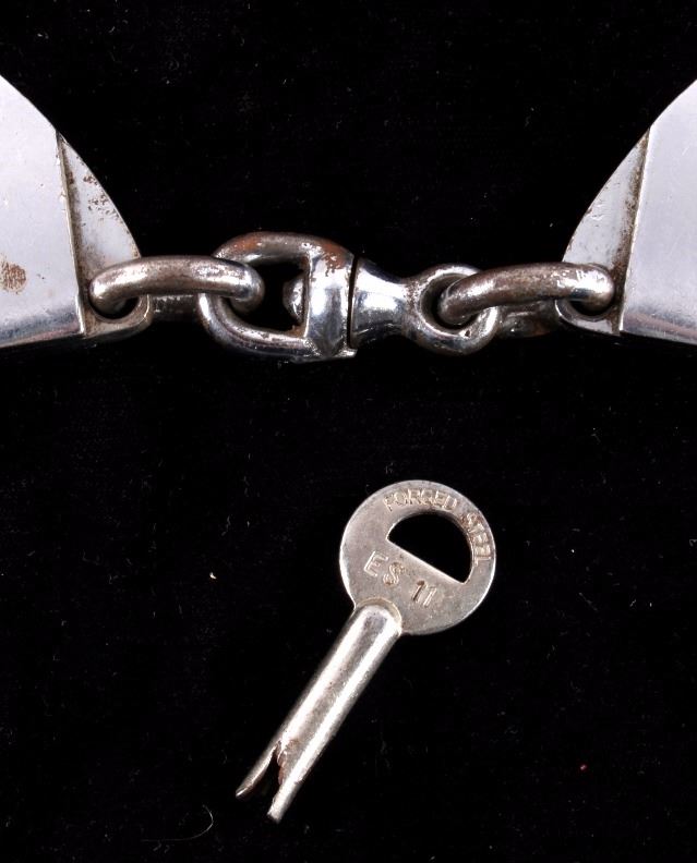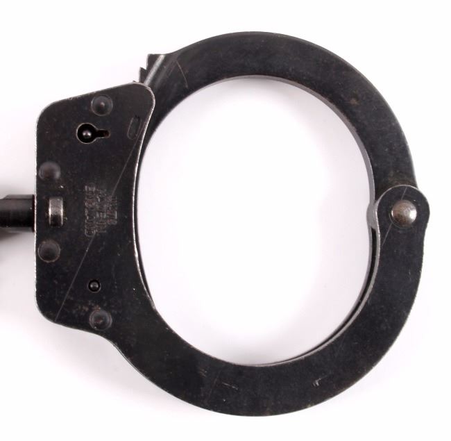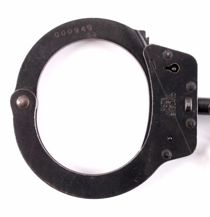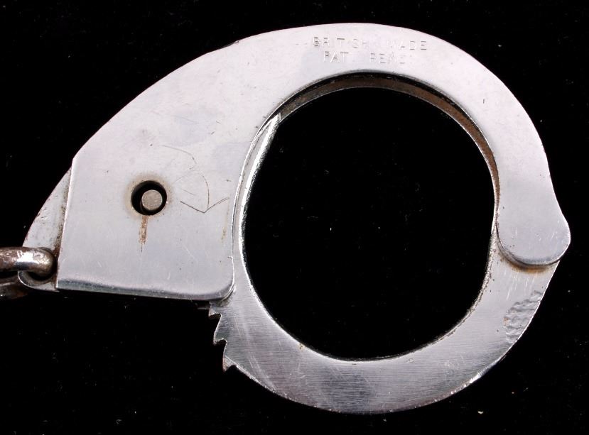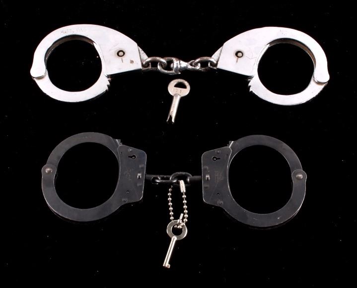This is two pairs of Hiatts handcuffs with keys. The blued pair is marked 'Hiatts Made in England" and the other pair is marked "Hiatts 1960 British Made". Both sets of handcuffs are in good condition and come with a working key. The larger pair measures 3" x 10'.