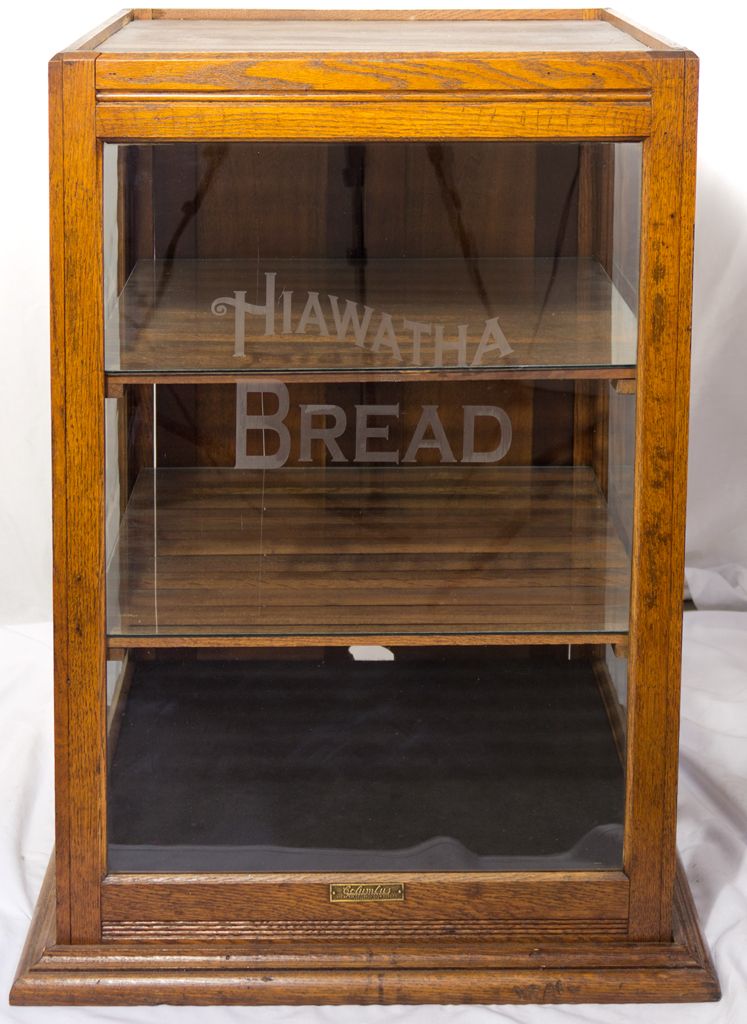 This 21" x 21" x 32" tall wooden and glass cabinet with two slotted shelves is etched "HIAWATHA/ BREAD" on the front. This bread display cabinet features glass on three sides, and a wooden double door on the rear to allow access. The lower corners of this door have been gnawed at by an ingenious rodent seeking the tasty breads within. Mitered oak construction. A wonderful piece. - Jacobitz Collection -60291