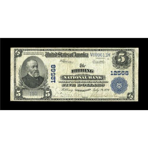 <B>Hibbing, MN</B></I> - $5 1902 Plain Back Fr. 609 <B>The Hibbing NB</B></I> Ch. # 12568<BR>A very scarce bank which was in business for less than four years before bowing out in 1928. Just three notes are listed in the census from here, with the Gengerke data showing exactly the same number of public offerings during the past six decades. Pen signed <B>Fine.</B></I><BR><BR><b>Shipping:</b> Coin/Currency (<a target="_blank" href="http://www.heritageauctions.com/common/shipping.php">view shipping information</a>)