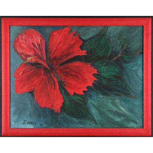 A floral scene of Hibiscus is by Ian Hall a British artist from the 20th century.</em></td>
