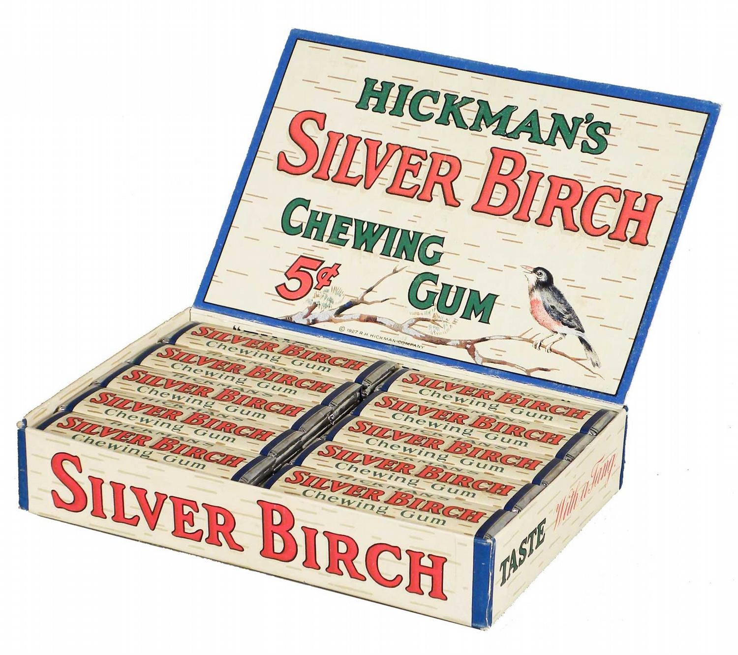 Hickman's Silver Birch Chewing Gum Cardboard Display Box. Made by R.H. Hickman Company, Pittsburgh, USA. Full of product. Box in near mint condition. 6 1/4 X 1 1/4 X 4 1/4 inches.