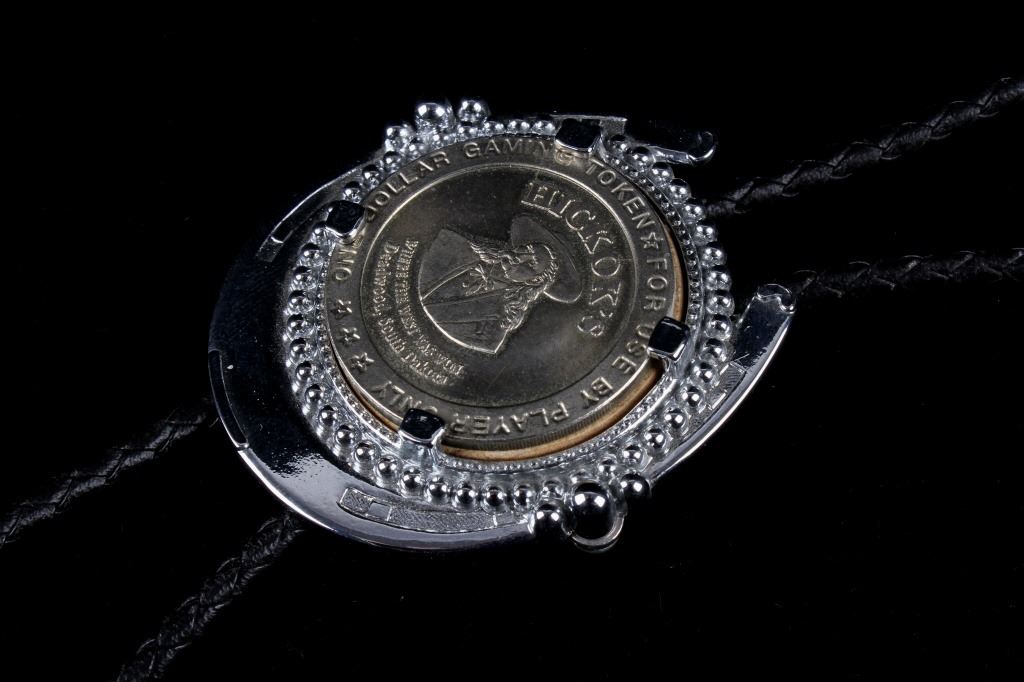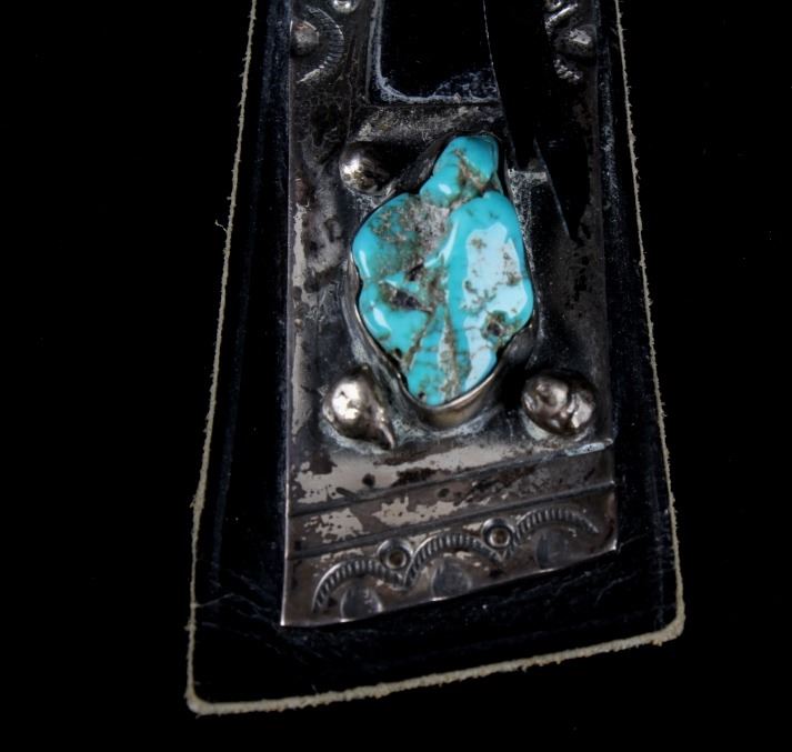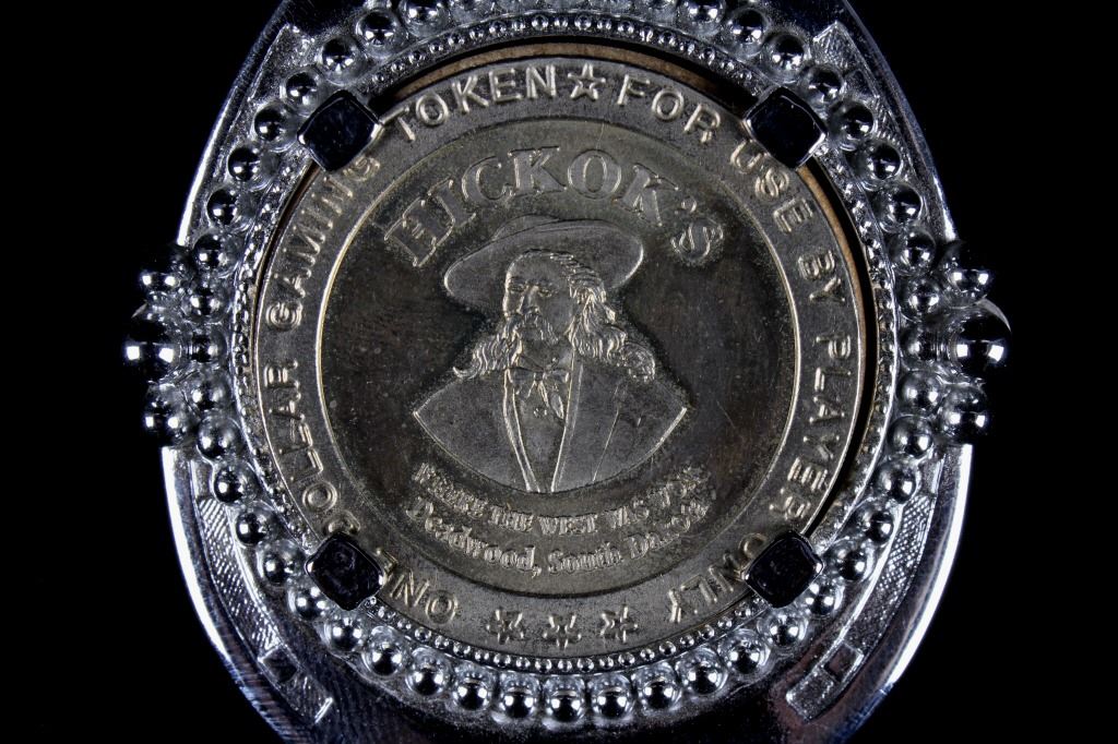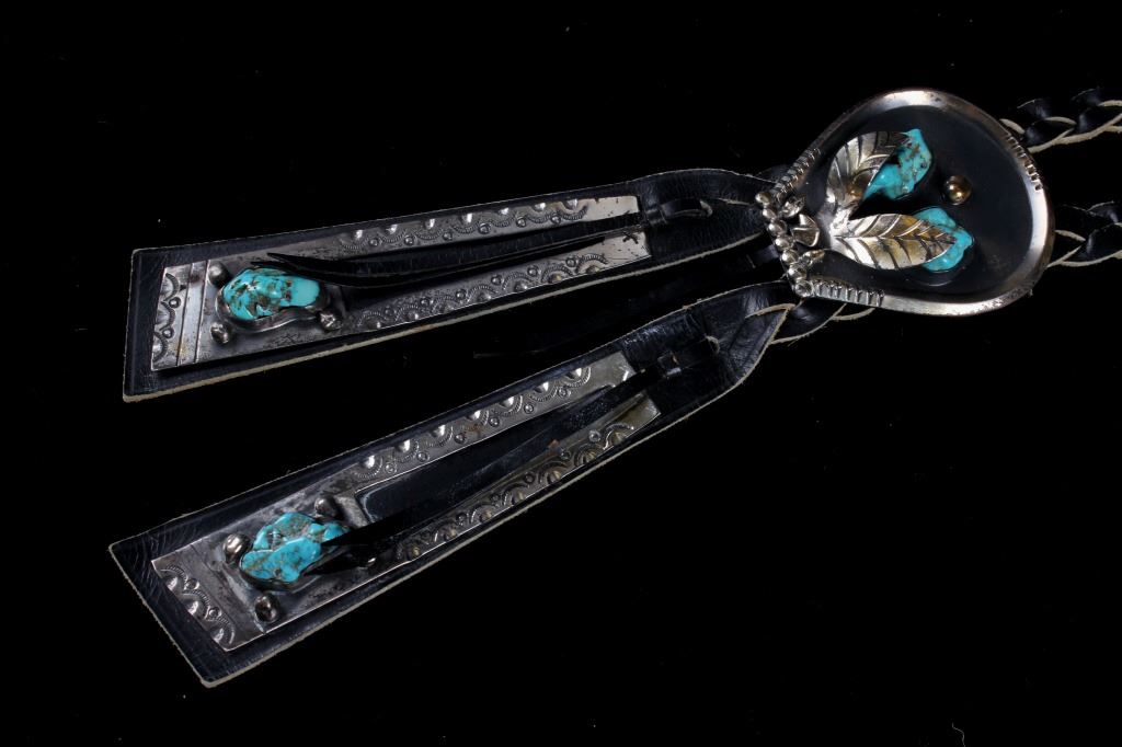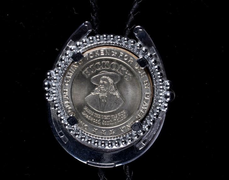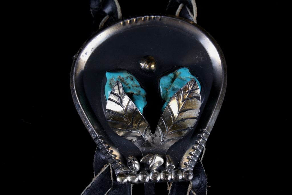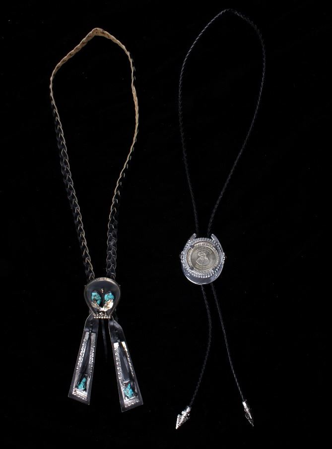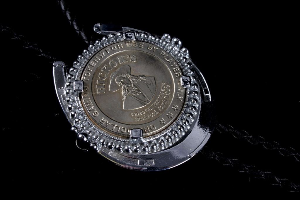 For your consideration is this Hickock gaming token bolo and silver and sleeping beauty turquoise bolo. The first bolo in this pair shows a Hickok gaming token adorning a silver horseshoe design with arrowhead aglets. The second bolo shows a silver with floral decoration and two rough cut sleeping beauty turquoise inlaid into the face of the bolo. The condition of these bolos is good, with no obvious signs of damage. The measurements of these two bolos are 19 1/4" x 2" and 21 1/2" x 2 1/4".