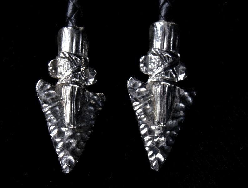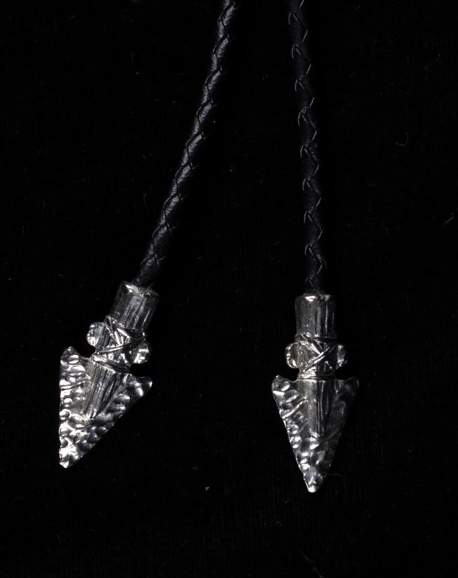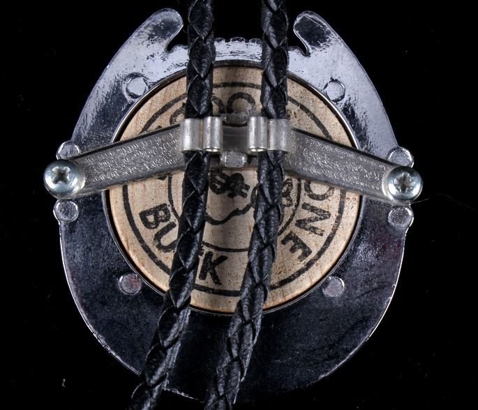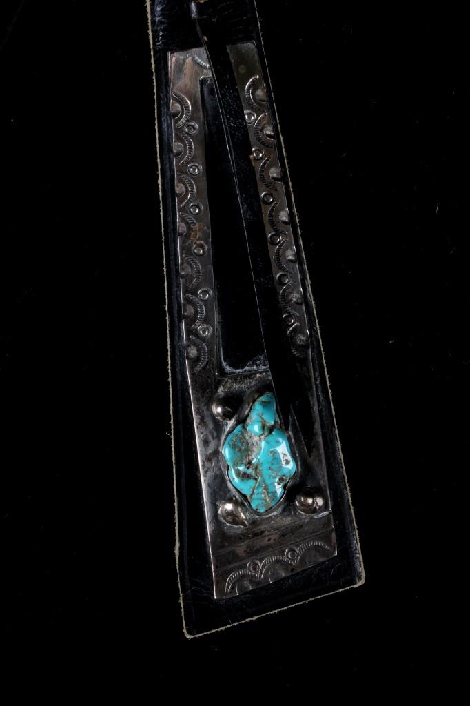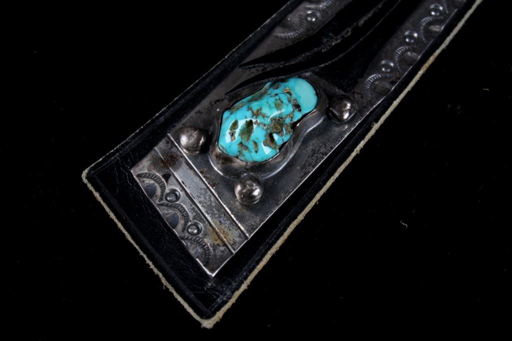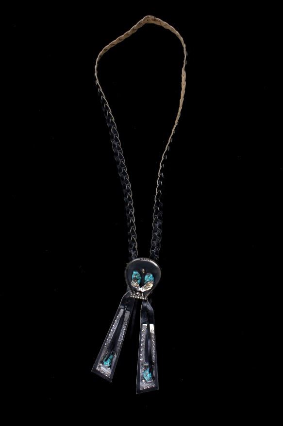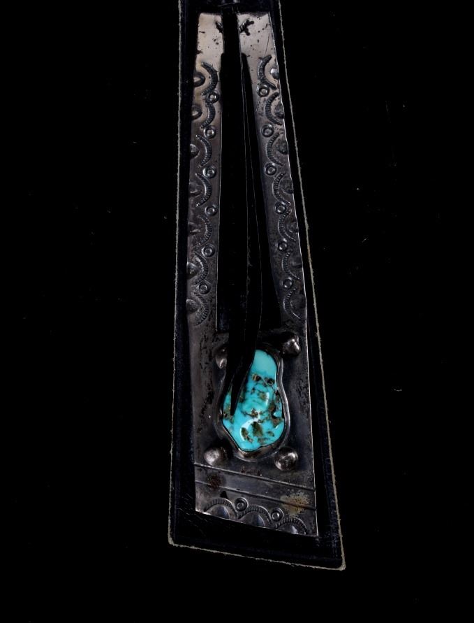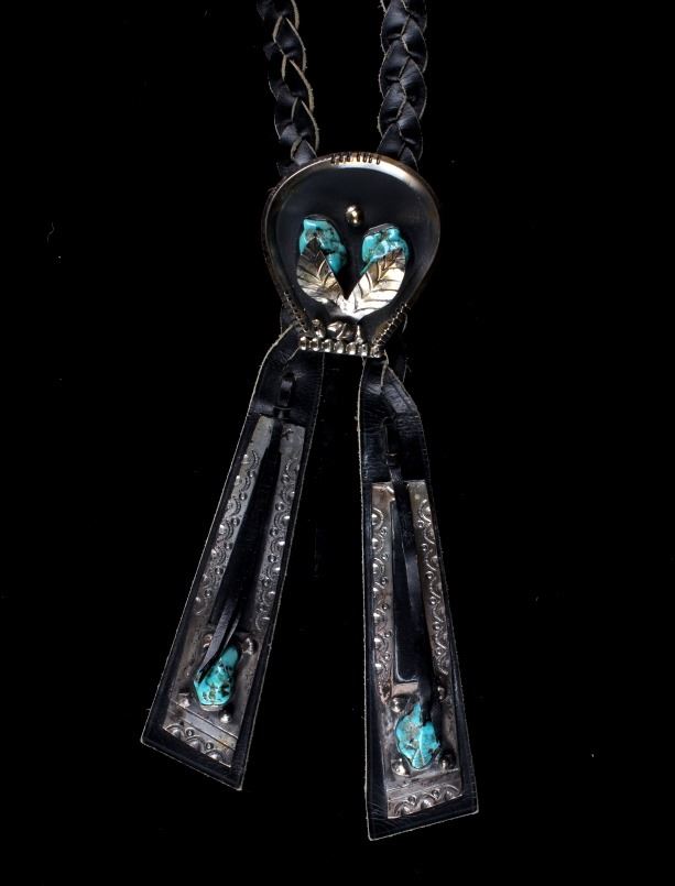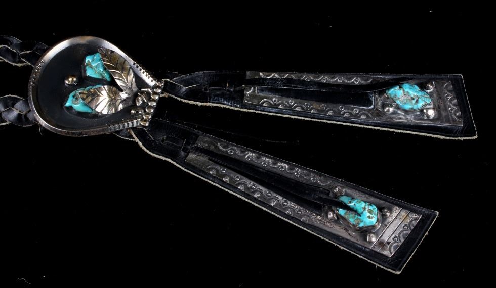 For your consideration is this Hickock gaming token bolo and silver and sleeping beauty turquoise bolo. The first bolo in this pair shows a Hickok gaming token adorning a silver horseshoe design with arrowhead aglets. The second bolo shows a silver with floral decoration and two rough cut sleeping beauty turquoise inlaid into the face of the bolo. The condition of these bolos is good, with no obvious signs of damage. The measurements of these two bolos are 19 1/4" x 2" and 21 1/2" x 2 1/4".