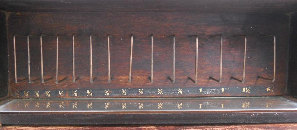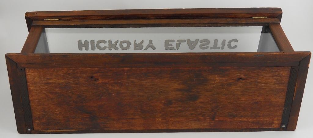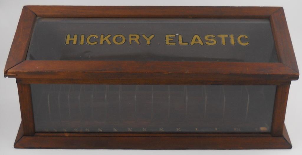 This case was used to sell Hickory Elastic. It has wire dividers inside on the bottom to hold different elastic sizes, from ¼ inch to 1-½ inches in width. It is made of wood and is 18 inches wide x 7 inches tall x 5- ½ inches deep. It has the original glass & decals. Beautiful display piece.