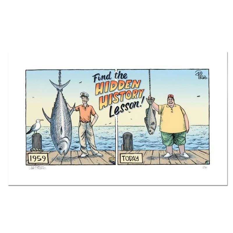 "Hidden History" is a limited edition giclee on paper by Dan Piraro creator of the critically acclaimed and award winning comic strip Bizarro. This piece is numbered and hand signed by the artist and includes a letterof authenticity. Measures approximtely 8" x 15" (image).