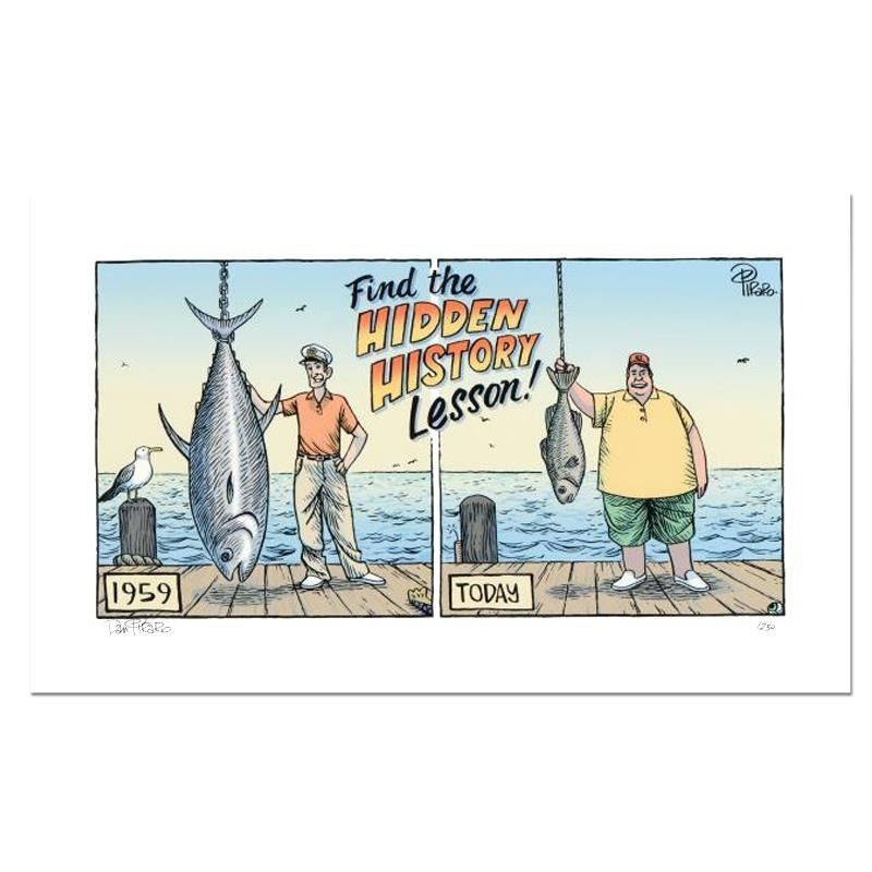 "Hidden History" is a limited edition giclee on paper by Dan Piraro, creator of the critically acclaimed and award winning comic strip, Bizarro. This piece is numbered and hand signed by the artist and includes a letterof authenticity. Measures approximtely 8" x 15" (image).