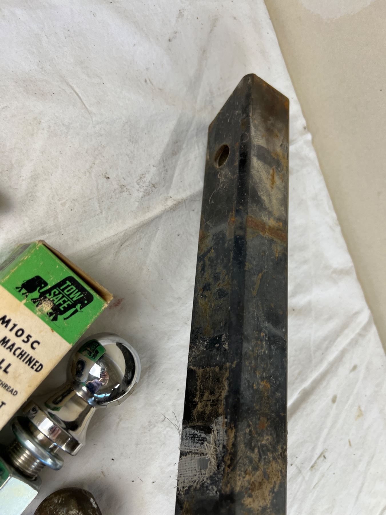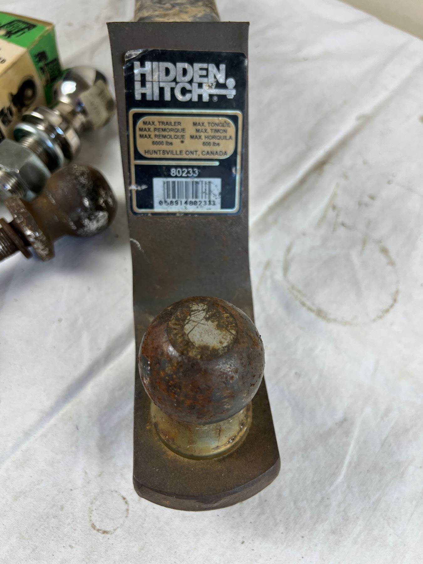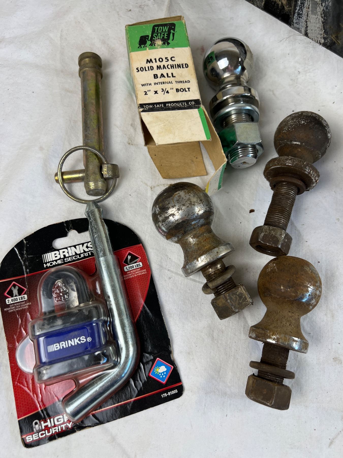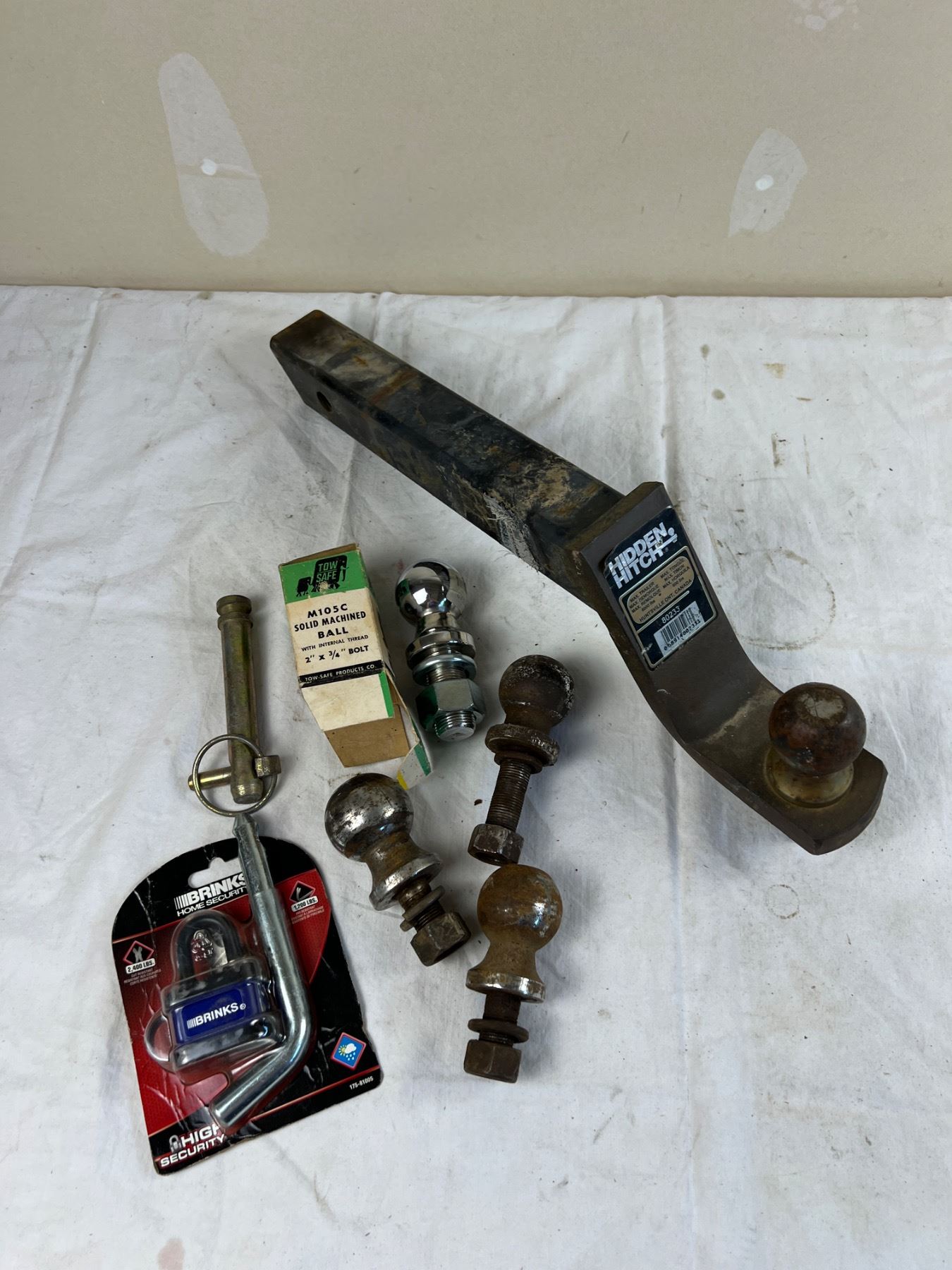 Includes a Hidden Hitch No. 80233, Various hitch balls, New Brinks lock, some rust and wear