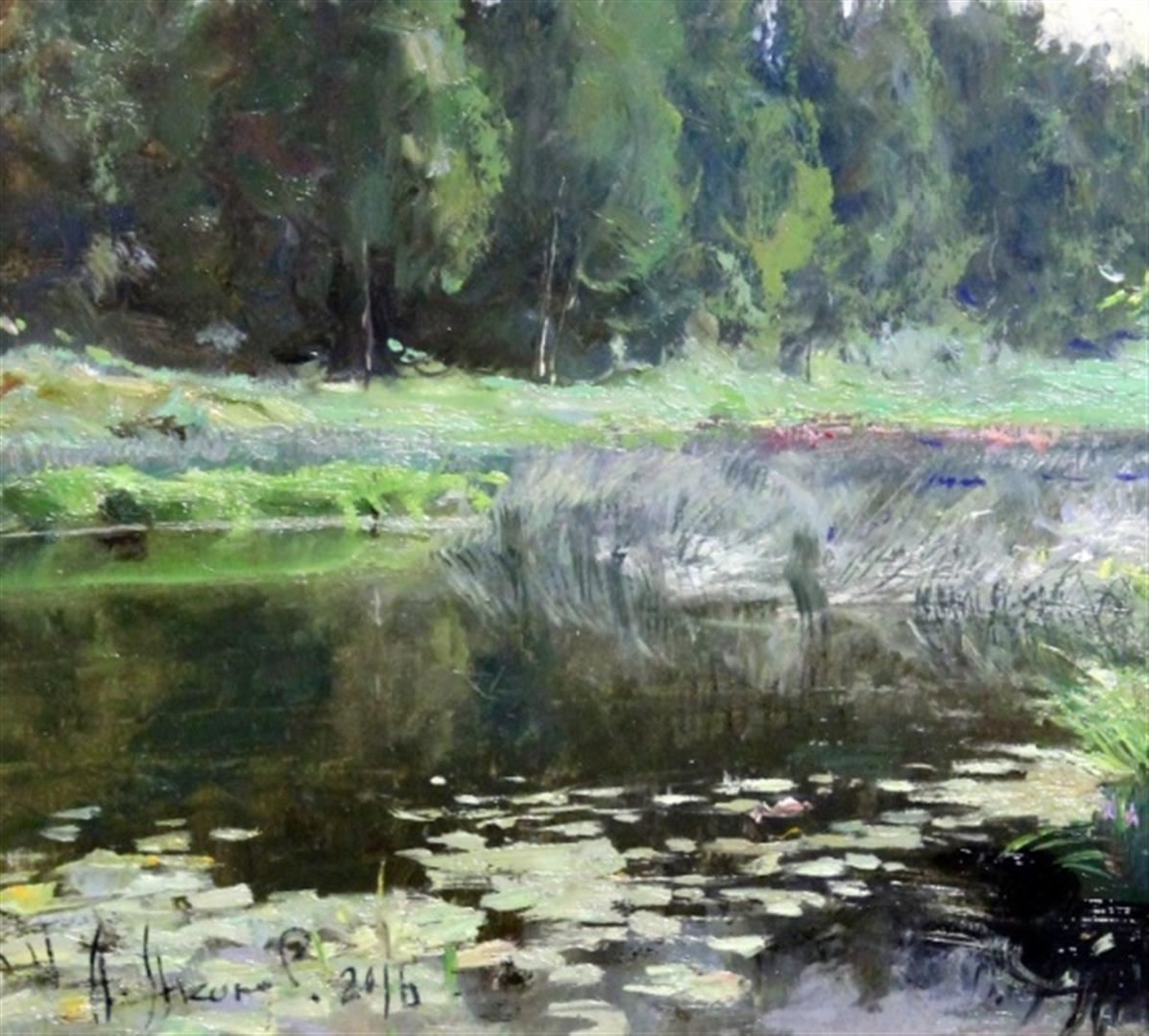 Hidden Pond by Alexander Akopov oil painting over-looking a lush pond with measurements framed of 16 1/2" x 17 1/2".