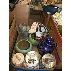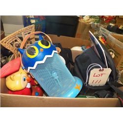 Box Lot Misc. owl decor. Box Lot Misc. owl decor. Box Lot Misc. owl decor. Box Lot Misc. Porcelain containers, 6 misc. shoulder/hand bags. Blue Vintage Quilt Tub misc. collectibles