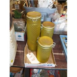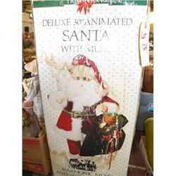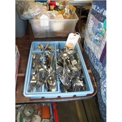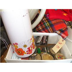 2 1/2 foot standing Santa, 3 sealed vintage jars misc. silverware and tray. tub misc. dishware, glassware, Box Lot Misc. novelty items and more. tub misc. dolls and toys
