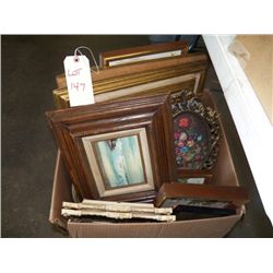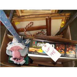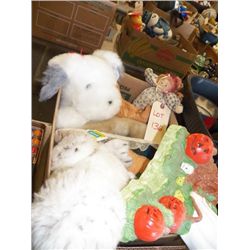 Box Lot Misc. Figurines Pictures Wood Framed of Owls and other Misc.Box Lot Misc. Stuffed Cow Animals.Box Lot Misc. Stuffed Toys