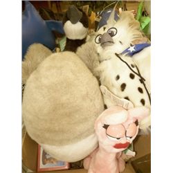 Box Lot Misc. Figurines Pictures Wood Framed of Owls and other Misc.Box Lot Misc. Stuffed Cow Animals.Box Lot Misc. Stuffed Toys