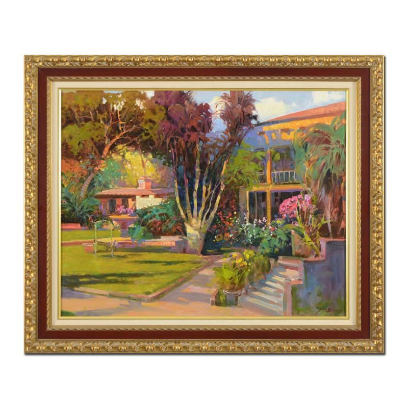 "Hideaway Villa" is an original oil painting on canvas by Ming Feng, hand signed by the artist. This piece comes framed. Includes Letter of Authenticity. Measures approx. 37" x 31" (frame), 29.5" x 23.5" (image). There is minor wear on the frame.