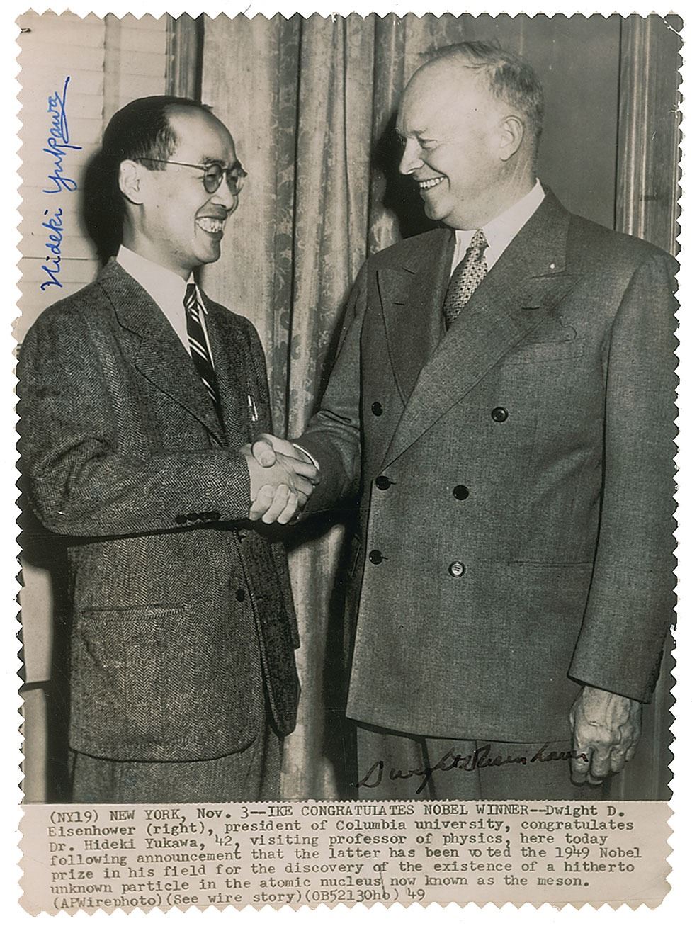 Vintage glossy 6.75 x 9 wire photo of Hideki Yukawa shaking hands with Columbia University President Dwight D. Eisenhower on November 3, 1949, signed vertically in blue fountain pen. Lower right features an autopen signature of Eisenhower, and reverse bears an Associated Press credit stamp. In very good condition, with overall creasing. In 1949, Yukawa became a professor at Columbia University, the same year he received the Nobel Prize in Physics.
