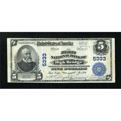 <B>High Bridge, NJ</B></I> - $5 1902 Plain Back Fr. 607 <B>The First NB</B></I> Ch. # 5333<BR> While twenty large size examples are now reported on this Hunterdon County location, this <B>Very Fine</B></I> $5 is a particularly attractive example with the folds showing primarily on the back. Dark stamped signatures definitely enhance the appearance of this bright note.<BR><BR><b>Shipping:</b> Coins & Currency (<a target="_blank" href="http://www.heritageauctions.com/common/shipping.php">view shipping information</a>)