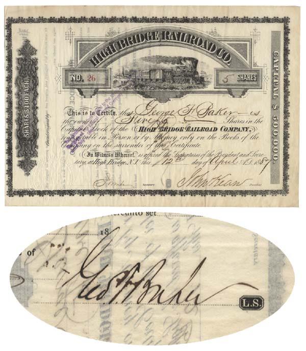 1887, New Jersey. Stock certificate for 5 shares. Black. Vignette of a steam locomotive at top center. Litho. Issued to and signed on verso by GEORGE F. BAKER (1840-1931). Banker; Philanthropist. Starting as a clerk in New York state's banking department in 1856, the clever and industrious Baker quickly came to the notice of many of the state's prominent bankers. By 1863, he had been lured from state employment, and was one of the founders of the First National Bank of New York, a bank that would become the most prominent of all banks under the new national banking system. During the Panic of 1873, he was largely responsible for keeping the bank afloat, and it was during this period that the bank began to more fully adopt Baker's philosophy and become a "banker's bank." Baker became the bank's second president in 1877, and aggressively continued the bank's policy of developing connections with great business corporations, both in the U.S. and overseas. A man of boundless energy, Baker sat on the boards of many corporations in a wide variety of industries, at one point sitting on some 87 boards simultaneously. At its height, his fortune was estimated at some $200 million but, at his death, after many years of donations to schools, libraries, museums, hospitals, churches, etc. his estate was valued at a mere $73.5 million. Stamp cancelled. Very Fine.