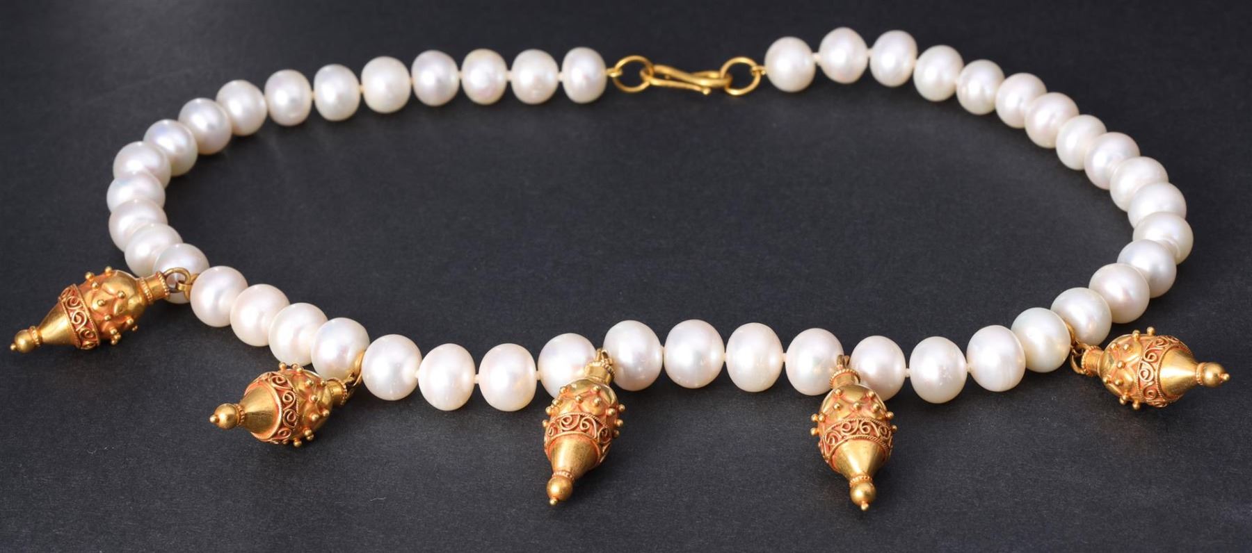 Strand of white pearls with elaborate high carat gold beads with intricate designs and clasp; gross weight 68.2g, L 8 1/2 inches (approx.)