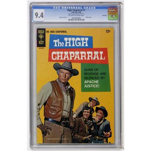<B>High Chaparral #1 File Copy (Gold Key, 1968) CGC NM 9.4 Off-white to white pages.</B></I> Photo cover. Warren Tufts art. CGC notes, "From the Random House Archives." Overstreet 2007 NM- 9.2 value = $70. CGC census 9/07: 6 in 9.4, 1 higher.<BR><BR><b>Shipping:</b> Comics - Slabbed (certified) (<a target="_blank" href="http://www.heritageauctions.com/common/shipping.php">view shipping information</a>)