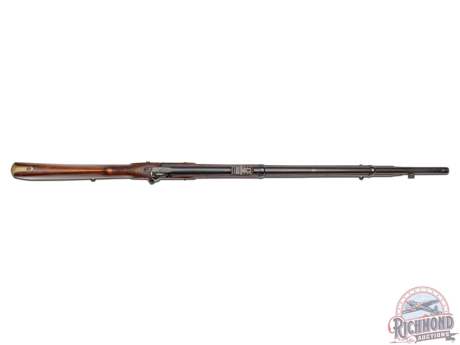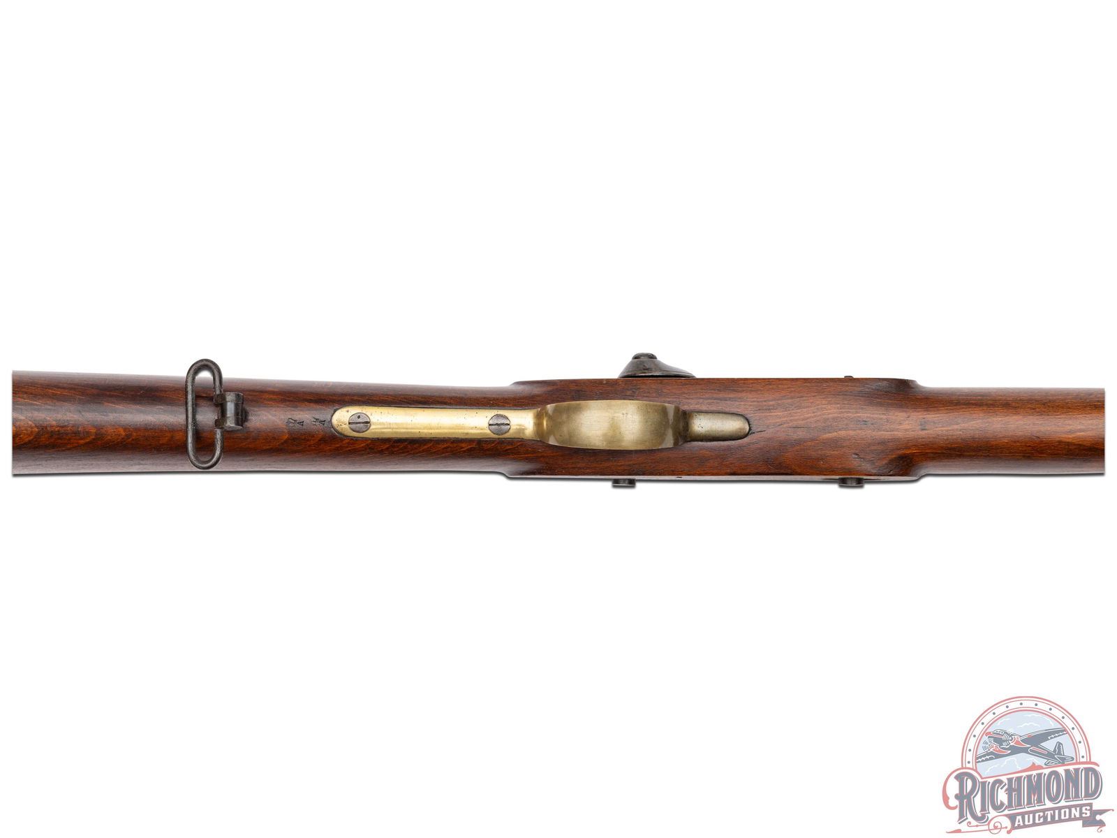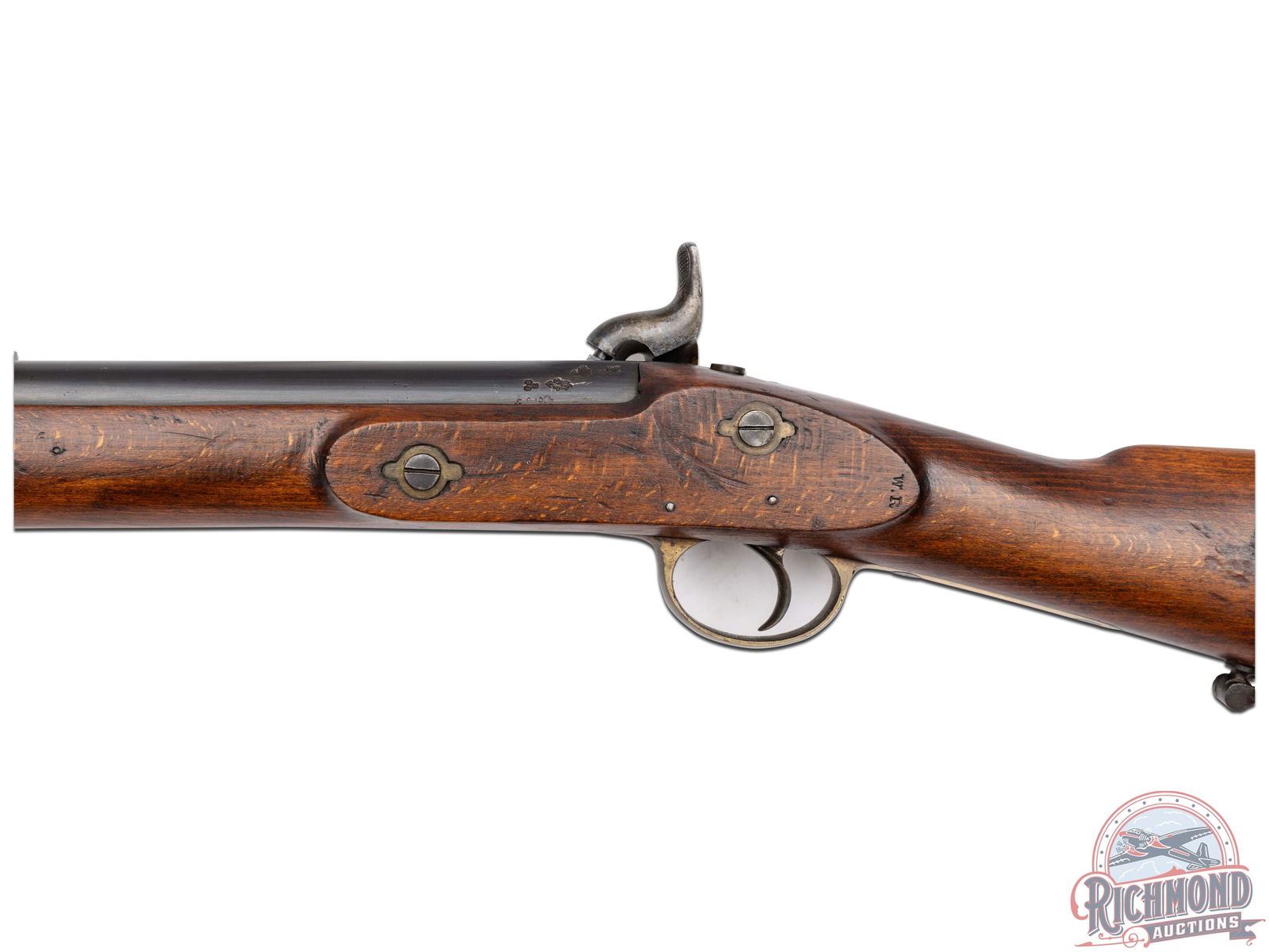 Made in England by Tower in 1860. These were often used by both the Union and Confederacy during the American Civil War. Blued 33" round rifled 577 caliber barrel with blade front sight, rollercoaster rear sight graduated to 1100 yards with side lug for Saber bayonet. Barrel has correct British Proof marks at breech with percussion ignition. Case-hardened percussion lock marked with "1860" date over "Tower" and "Crown/V.R." at rear of lock. Action is controlled by standard plain trigger. Standard full Military hardwood stock with brass furniture and two blued barrel bands. Comes with correct steel ramrod. CALIBER: 577. FFL STATUS: Antique.