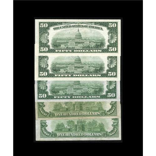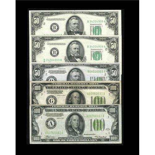 <B>High Denomination Mix.</B></I><BR>Fr. 2102-B $50 1934 Federal Reserve Note <B>Gem CU.</B></I><BR>Fr. 2111-B $50 1950D Federal Reserve Notes Two Consecutive Examples <B>Ch CU.</B></I><BR>Fr. 2151-G $100 1928A LGS Federal Reserve Note <B>VF.</B></I><BR>Fr. 2152-A $100 1934 LGS Federal Reserve Note <B>AU.</B></I><BR>