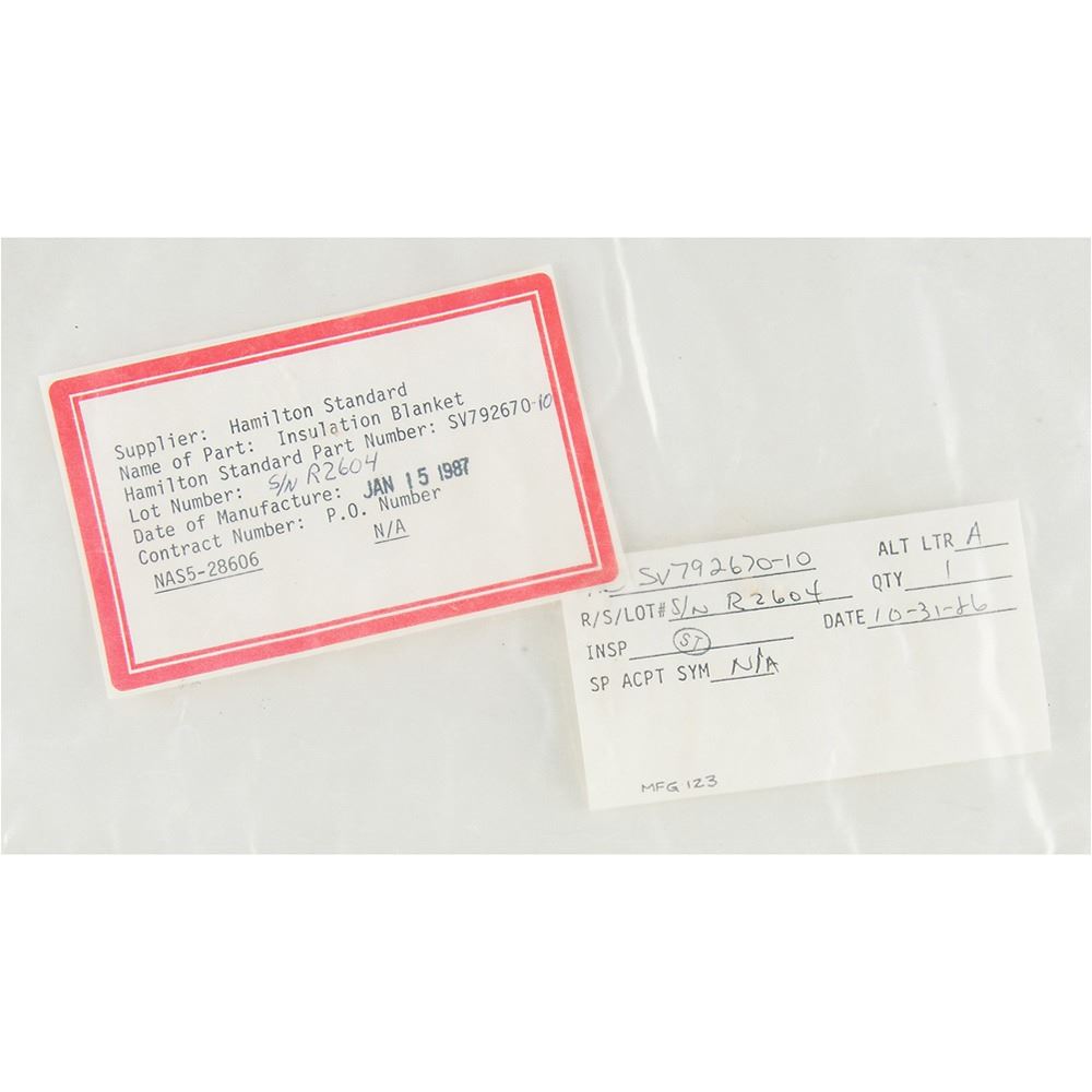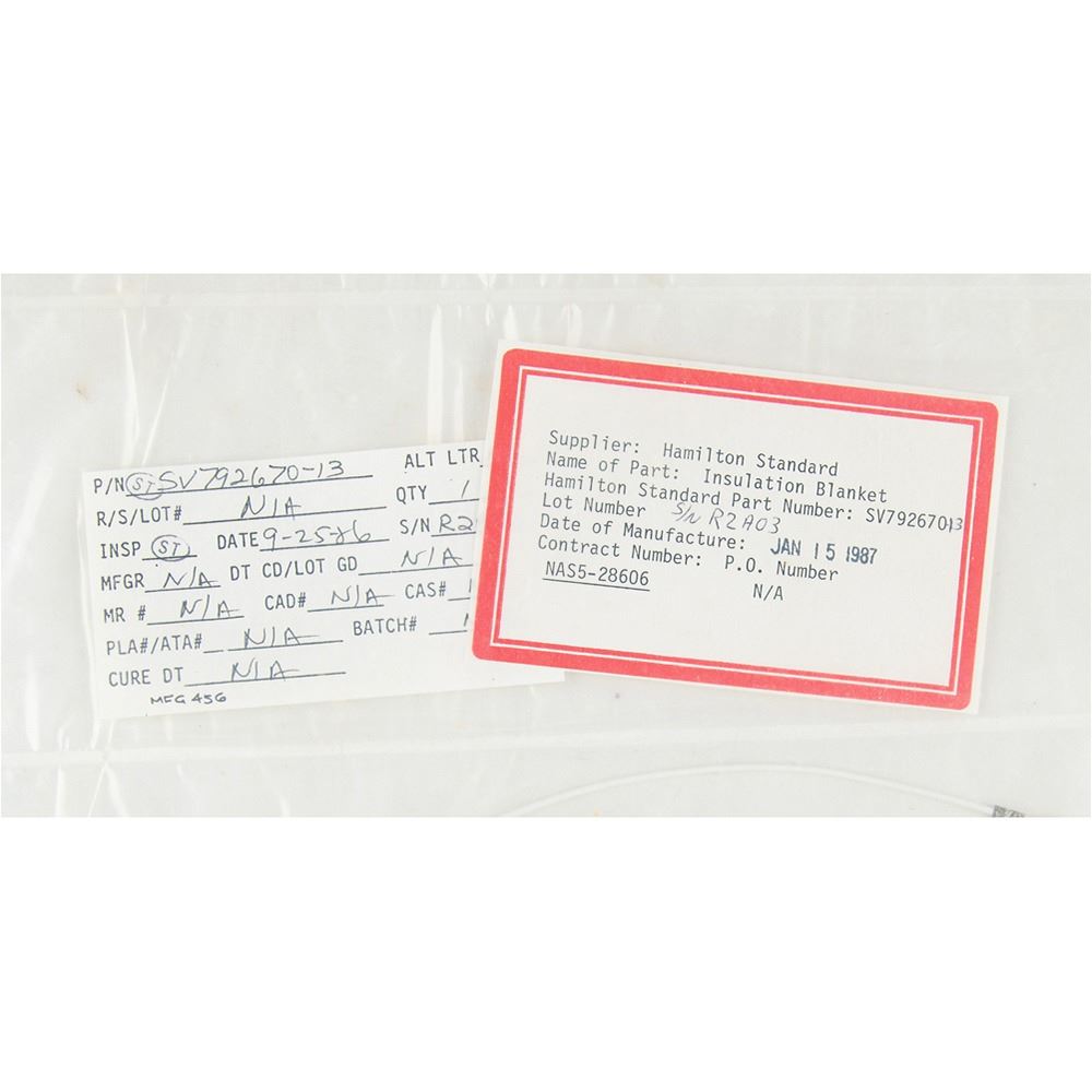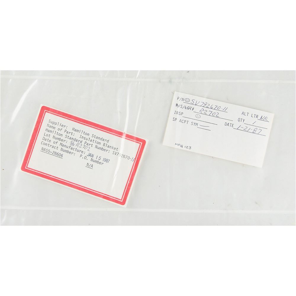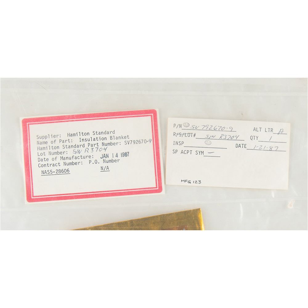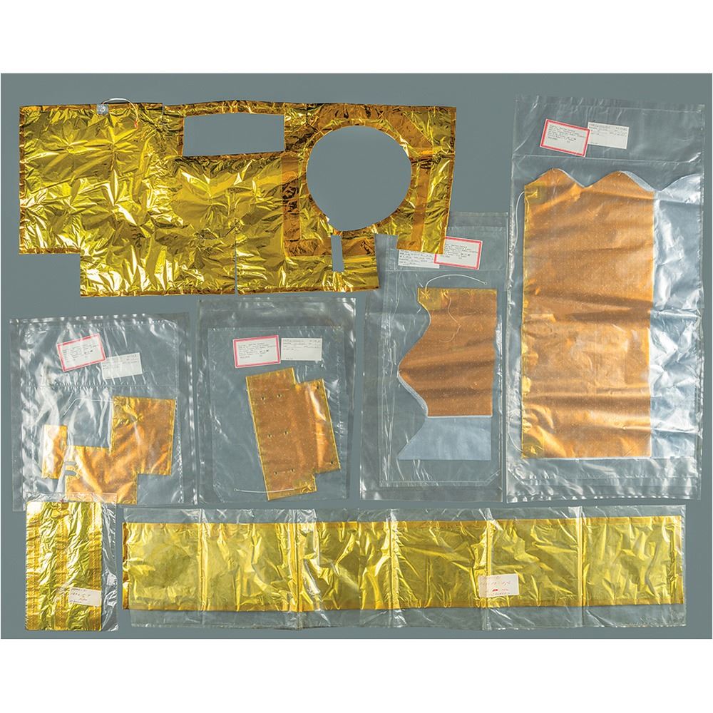 Group of seven multilayer insulation (MLI) 'blankets' made for the High Energy Astronomy Observatory C (the third HEAO spacecraft). They provided thermal insulation with multiple layers of aluminized polyimide plastic sheeting. Some layers also provide some structural strength for the blankets with embedded fibers. Because of the thin aluminum coating, they can be conductive, so some blankets have electrical leads to allow any accumulated electrical charge to 'bleed off.' The pieces are various shapes and sizes, ranging from about 7è x 12è to 25è x 16è, and many are in their plastic packaging with cards identifying part and serial numbers; two labels are marked "HEAO-C."