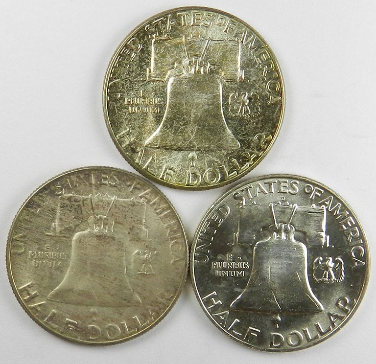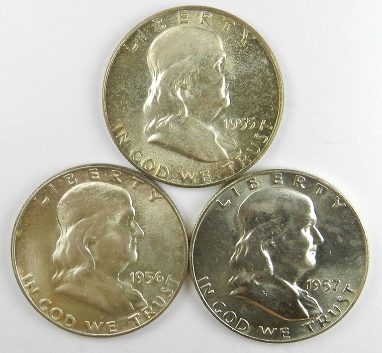 Franklin Half Trio,1955, 1956 and 1957. All very Choice to Gem Unc, the first two with lovely multi-color toning, the last mostly white. 3 coins.