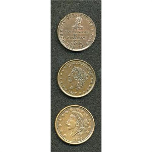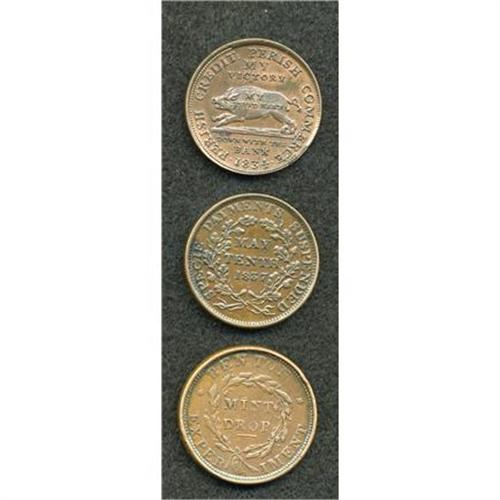 <B>Trio of High-Grade Hard Times Tokens.</B></I> Copper. Includes the following high-grade Hard Times tokens: <B>HT-9, with luster; HT-63, XF; </B></I>and<B> HT-65, Choice AU. </B></I>Finer than usually seen.<BR><BR><b>Shipping:</b> Coins & Currency (<a target="_blank" href="http://www.heritageauctions.com/common/shipping.php">view shipping information</a>)