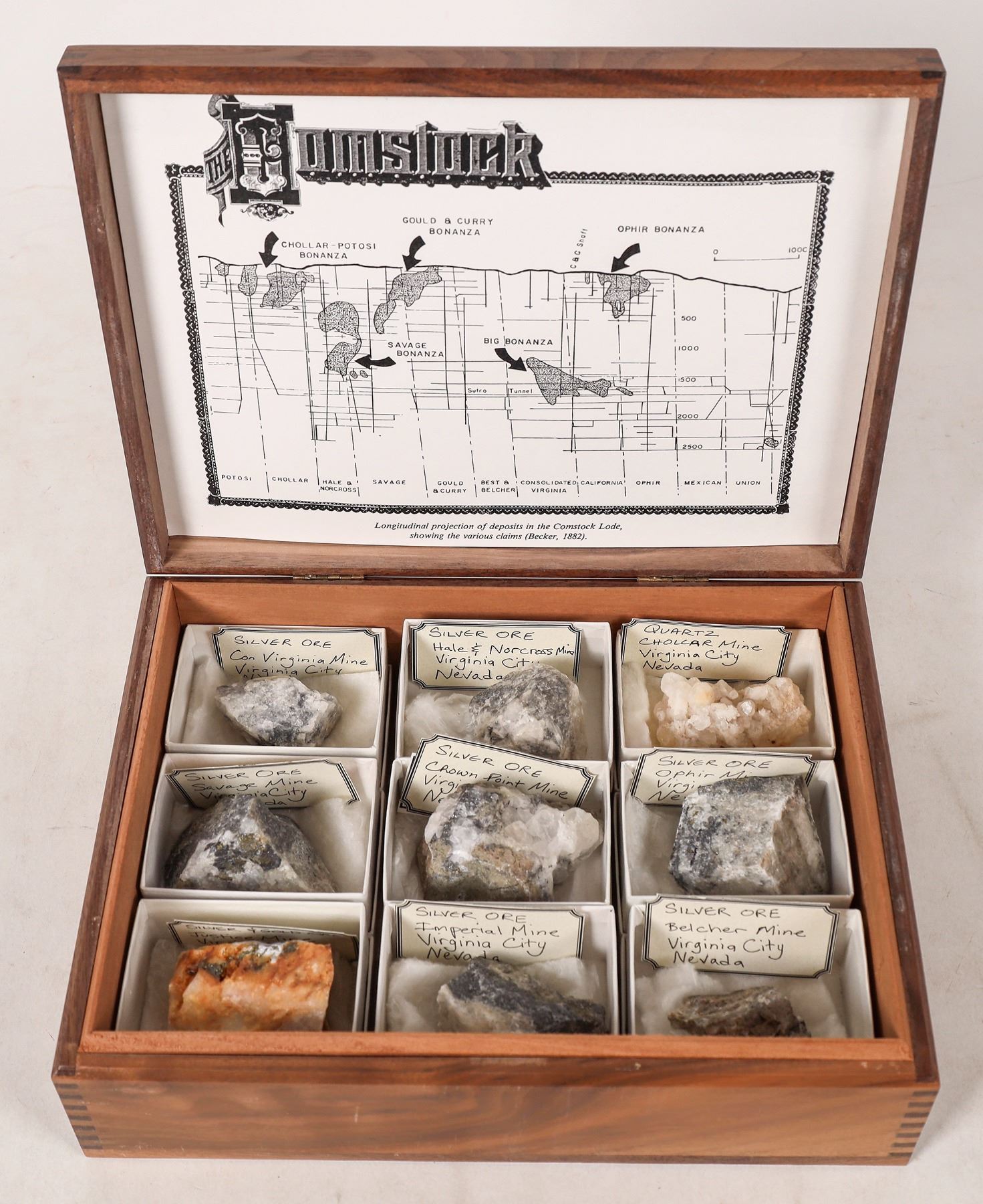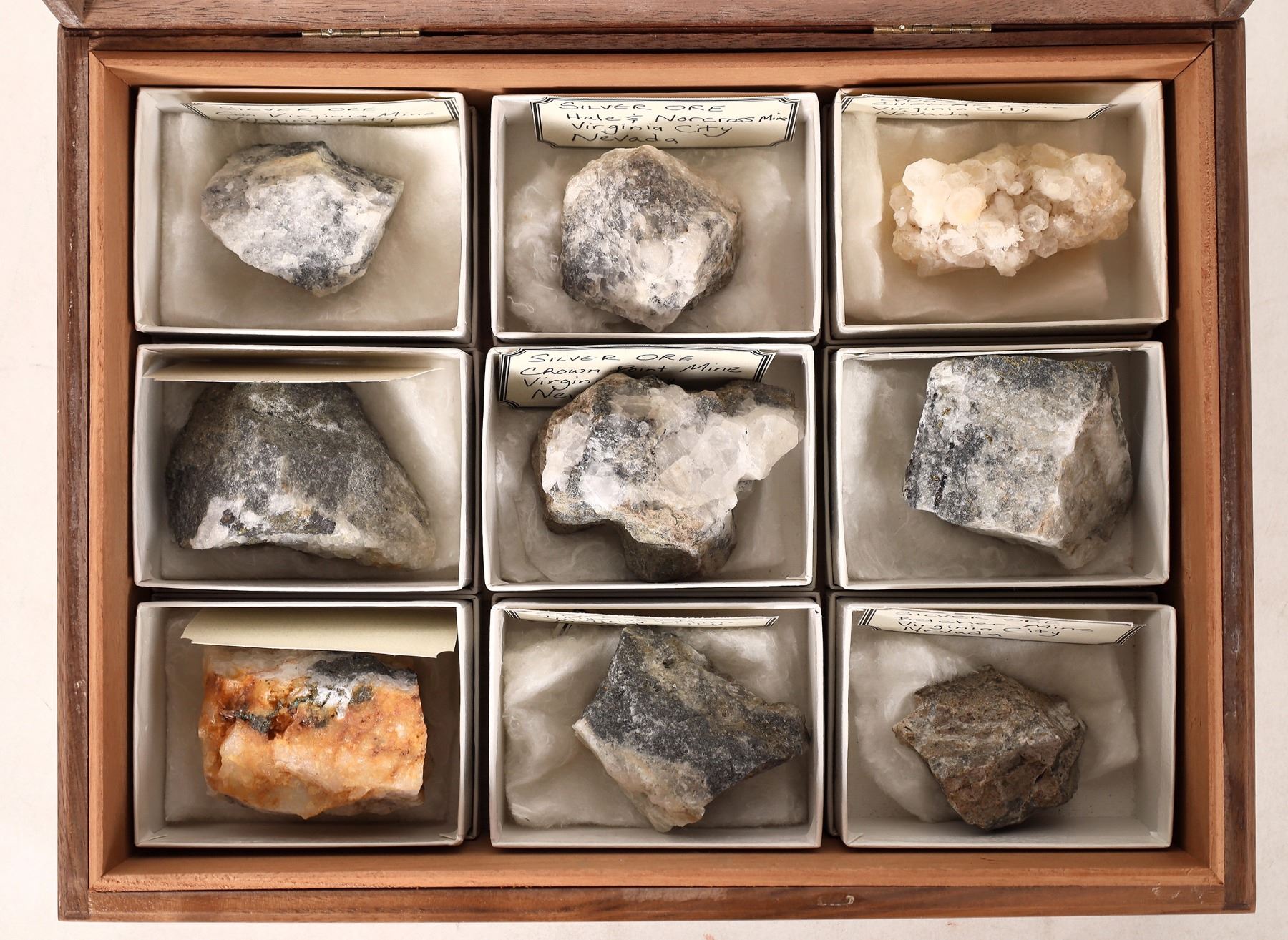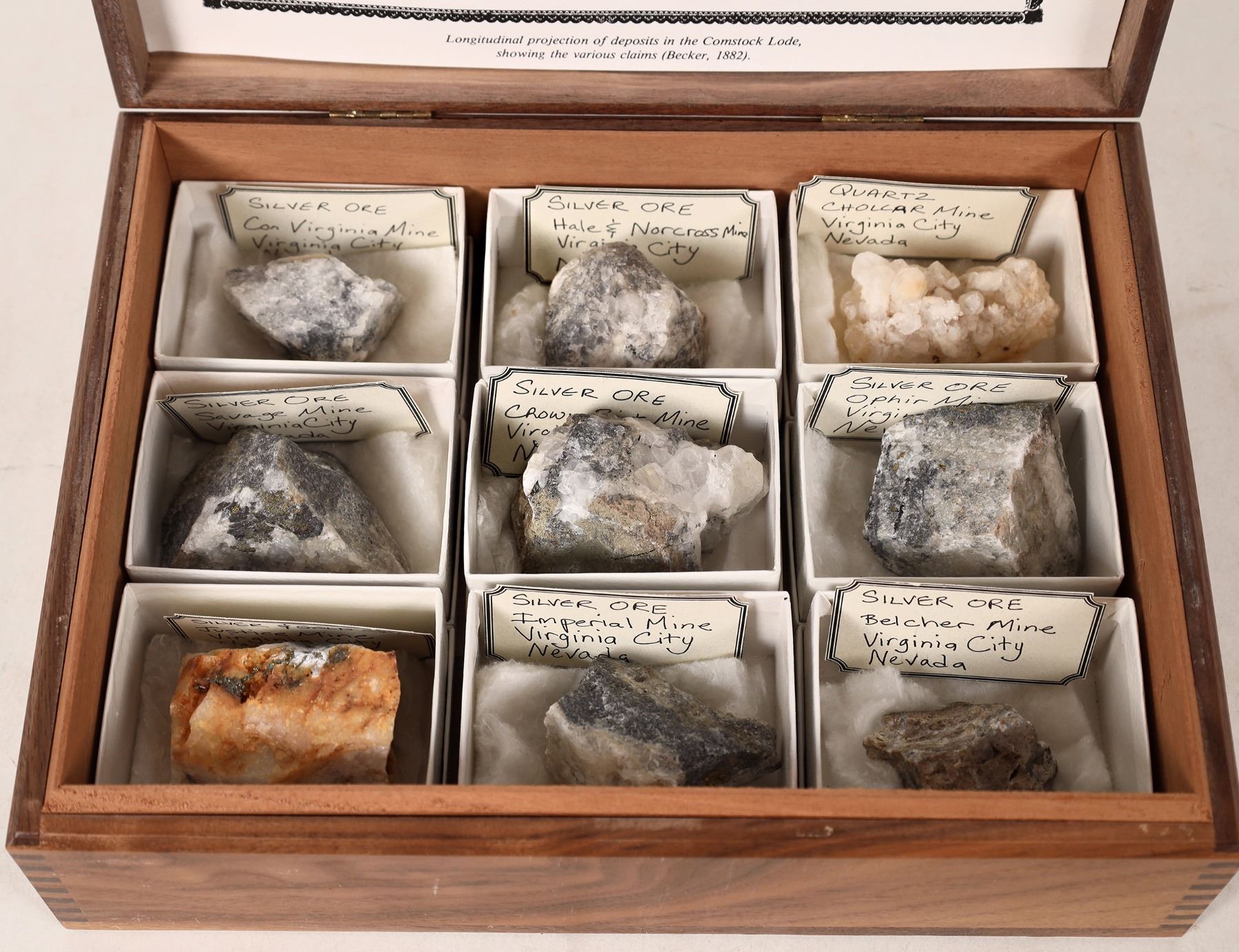 lot of nine specimens. Comes in a nice wooden box. 1) Silver & Gold ore Justice Mine 2.) Silver Ore Savage Mine 3.) Silver Ore Virginia Mine 4.) Silver Ore Con Virgnia 5.) Silver Ore Crown Point Mine 6.) Silver Ore Hale & Norecross 7.) Silver ore Beclher Mine 8.) Silver Ore Ohir Mine 9.) Quartz Chollar Mine Virginia City Nevada