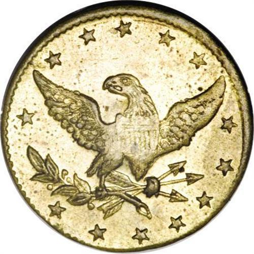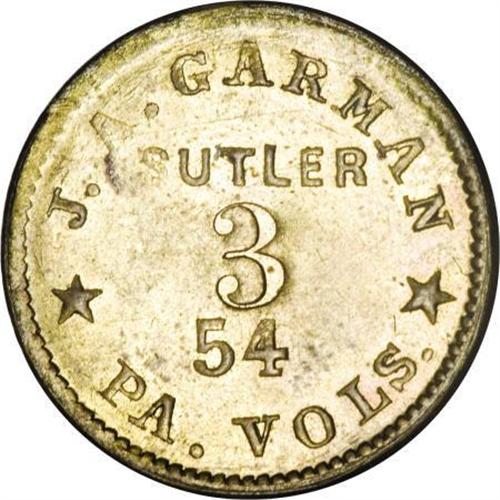 <B>High Grade R.5 Civil War Sutler Token 3 Cent Token. </B></I> Schenkman-13B, R.5. Brass, 18 mm. A Choice AU Civil War token issued by <B>J.A. Garman, sutler</B></I> for the 54 Pa. Vols, 3 incused (spread eagle within circle of 13 stars on the reverse). <BR> <BR><BR><b>Shipping:</b> Coins & Currency (<a target="_blank" href="http://www.heritageauctions.com/common/shipping.php">view shipping information</a>)