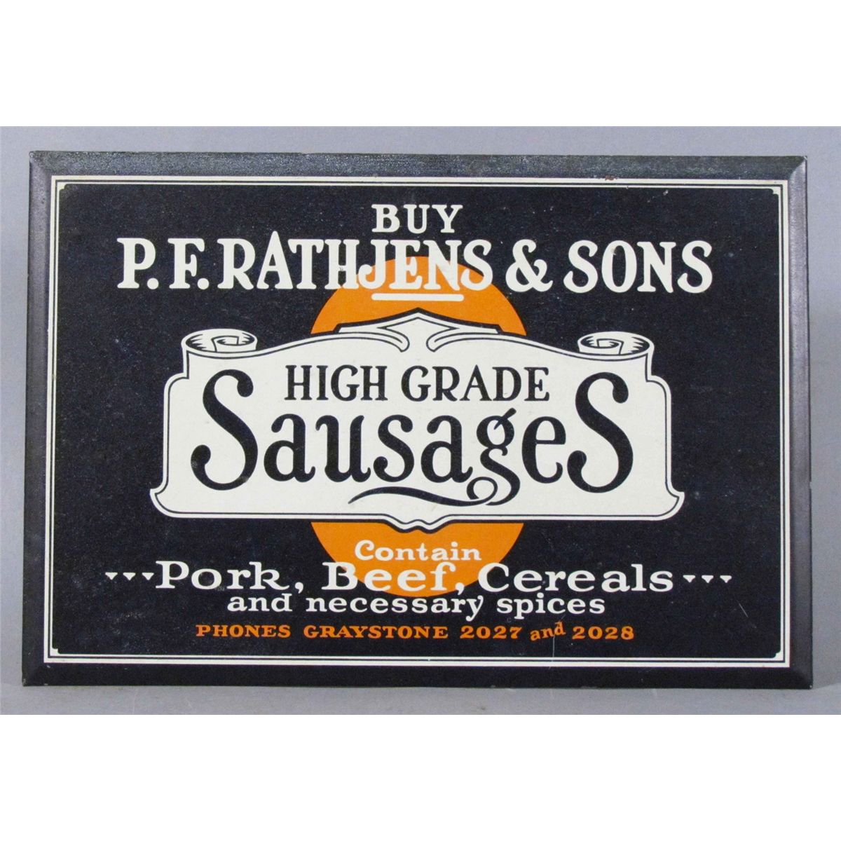 High Grade Sausages Tin Over Cardboard String Hanger Sign. Top shows fading otherwise very good condition. 9 1/2 X 6 1/2 inches. Start Price $40