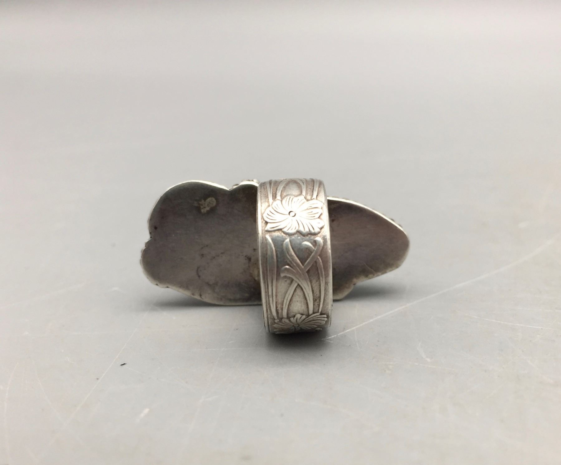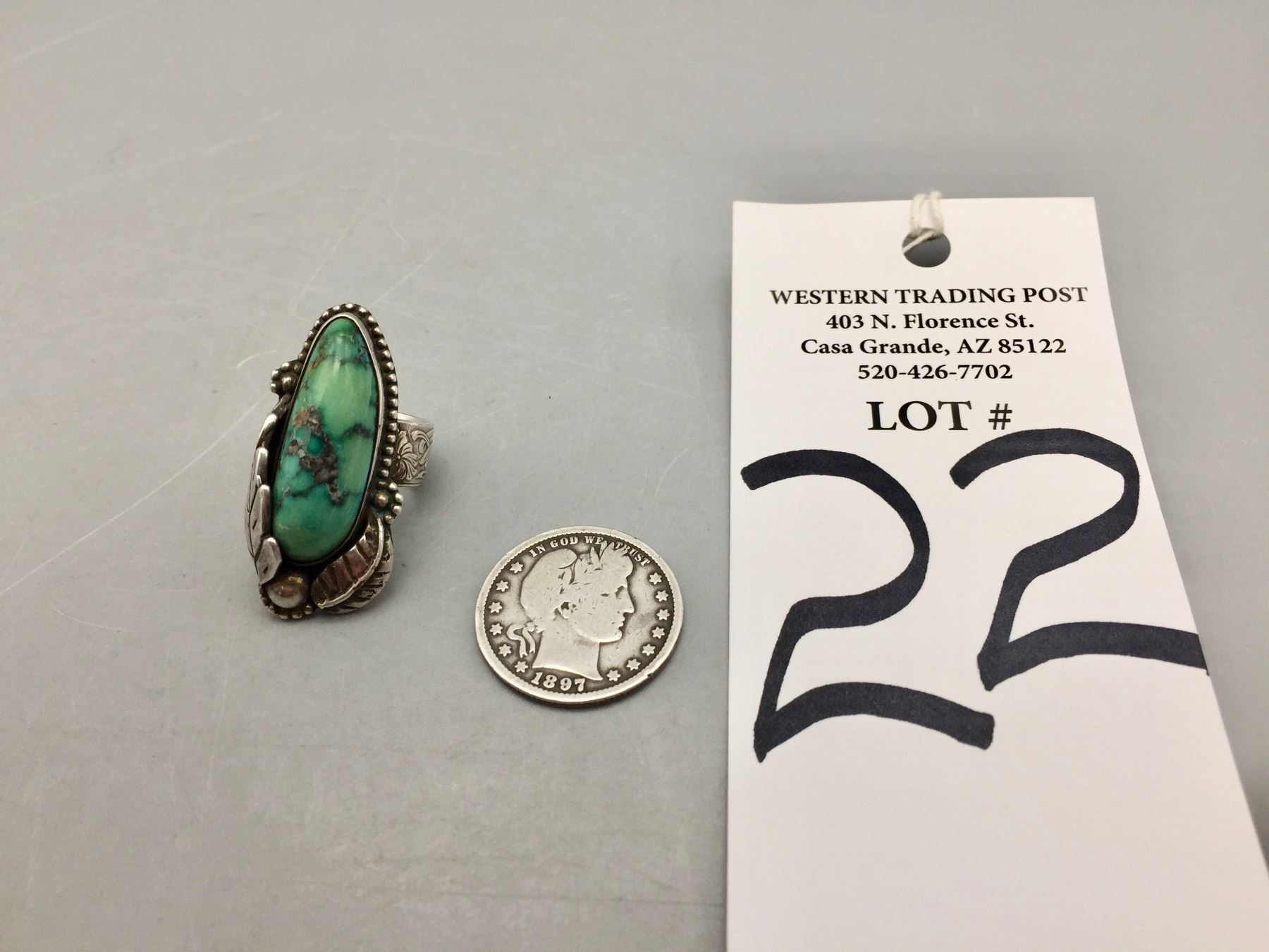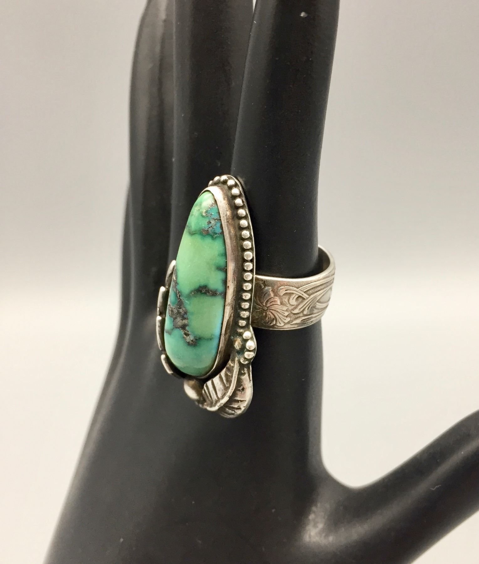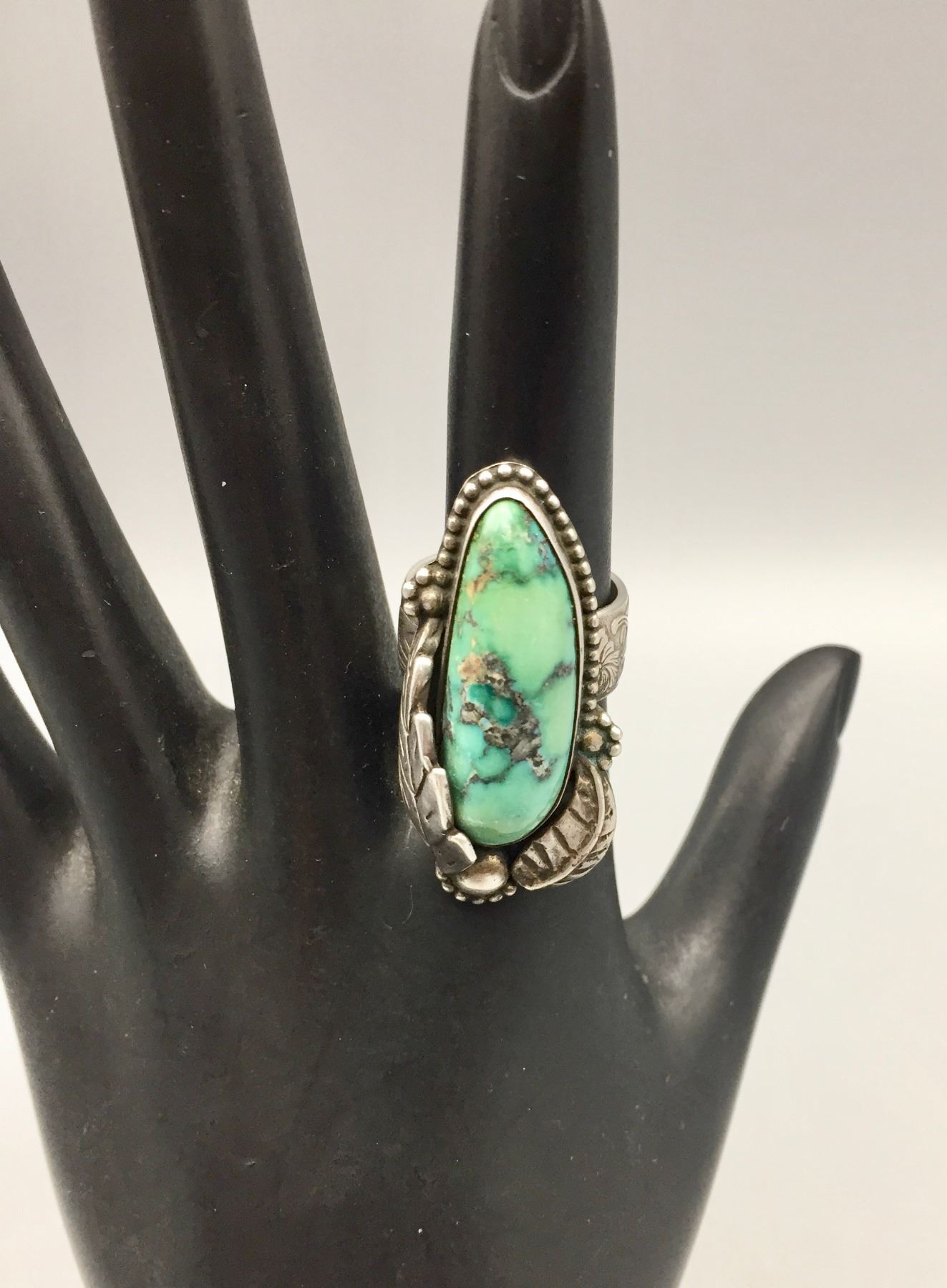 Description: Included in this lot is a high grade turquoise ring. This ring features a green turquoise cabochon, with sterling silver leaf appliqué. Maker: Unknown. Approx. Age: Vintage. Size: Size 6. Measures 5/8”w x 1-3/8” long. Weighs 15 grams. Condition: Good for its age, normal wear expected. Please look closely at the pictures - they are an important part of our description. Shipping: There will be a $5 handling / packaging fee for shipping this lot. The actual cost of postage will be added on top of that.