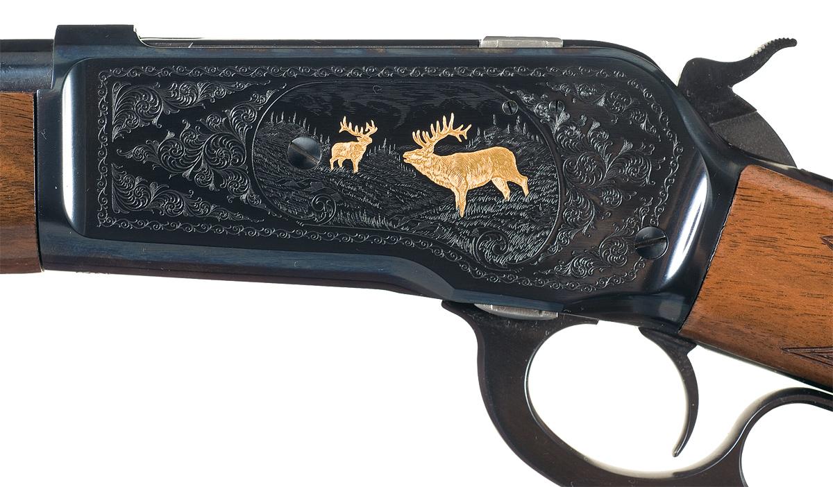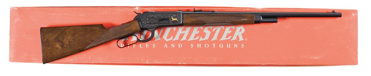 This model was introduced in 2000 and manufactured in Japan by B.C. Miroku and is similar to the Model 1886 Classic, but fitted with a 22 inch light weight tapered barrel and half magazine. The left side of the barrel is marked "U.S REPEATING ARMS CO. INC. NEW HAVEN CT. U.S.A. / JAPAN/MIROKU" and "CAL. 45-70 GOVT." the right side is marked "WINCHESTER MODEL 1886 EXTRA LIGHT RIFLE WINCHESTER LICENSEE". Fixed front sight and adjustable buckhorn style rear sight. The receiver is scroll engraved with two gold highlighted bull elk in a wooded scene on the left side and a running gold highlighted white tail in a wooded scene on the right. Extra fancy high gloss checkered forearm with a metal forend and straight grip stock with a checkered steel buttplate. Complete with the original box numbered to the gun with papers and cable lock.