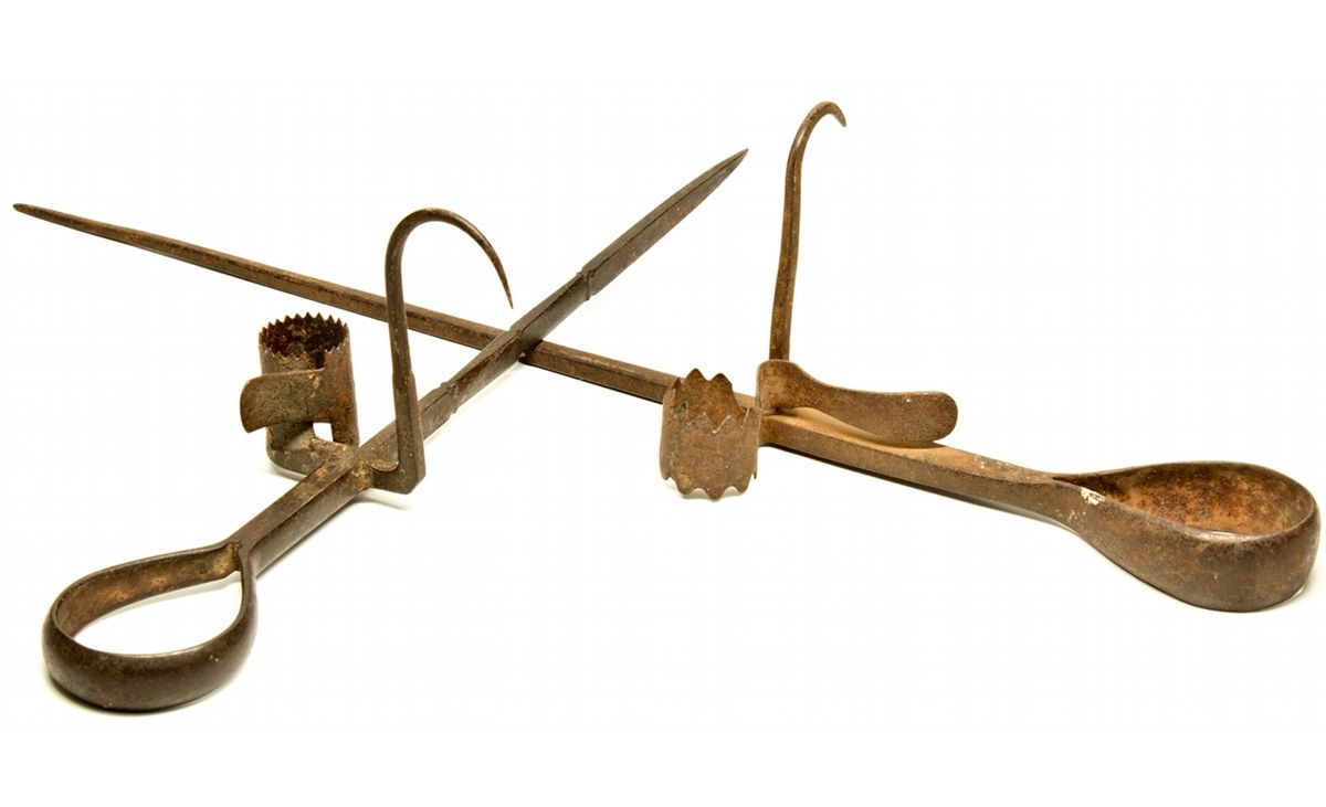 These are 2 great high grader sticks from the Trinity-Klamath region on California. The first is a fancy model and has similar characteristics of a C. Cleaves candlestick including a fancy design on the stick. This stick measures 11.5.” The other stick measures at 14” in length and has a long thimble. Both show age discoloration and could use a good cleaning. These are just two basic no-nonsense sticks. - HKA#62740
