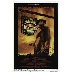 <B>High Plains Drifter (Universal, 1974)</B></I> One Sheet (27" X 41"). Clint Eastwood is a nameless gunslinger who rides into the small western town of Lago. The residents are fearful of a group of outlaws that have sworn vengeance on the community and hire Eastwood to defend them. But when the mysterious stranger has the corrupt town folk paint the buildings red and rename it Hell, they realize he's not just another drifter. There is light fold line wear, corner pinholes, one small border tear and pencil writing in the bottom border. This one sheet is considered by most collectors to be the best poster ever created for an Eastwood film! Very Fine-.