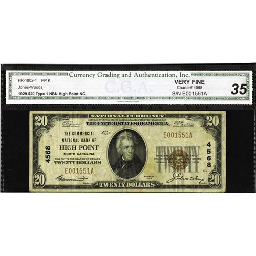 <B>High Point, NC</B></I> - $20 1929 Ty. 1 <B>The Commercial NB </B></I> Ch. # 4568<BR>Although two issuers were located here, this was the only one to order the 1929 series, its competitor having closed its doors in 1907. New to the Kelly census, this CGA <B>Very Fine 35</B></I> example comes from a locale closely identified with the furniture manufacturing industry.
