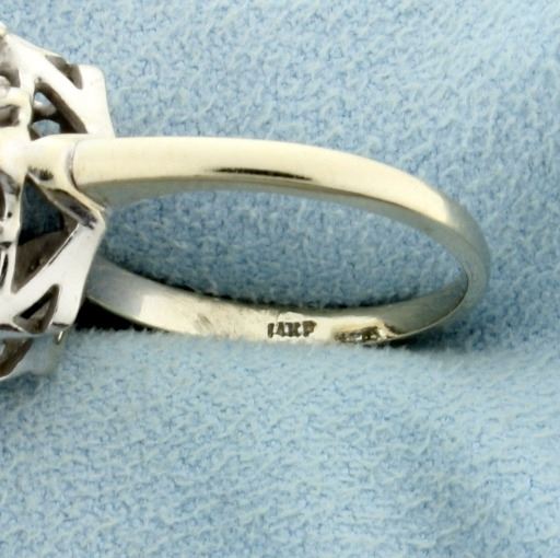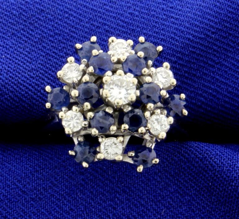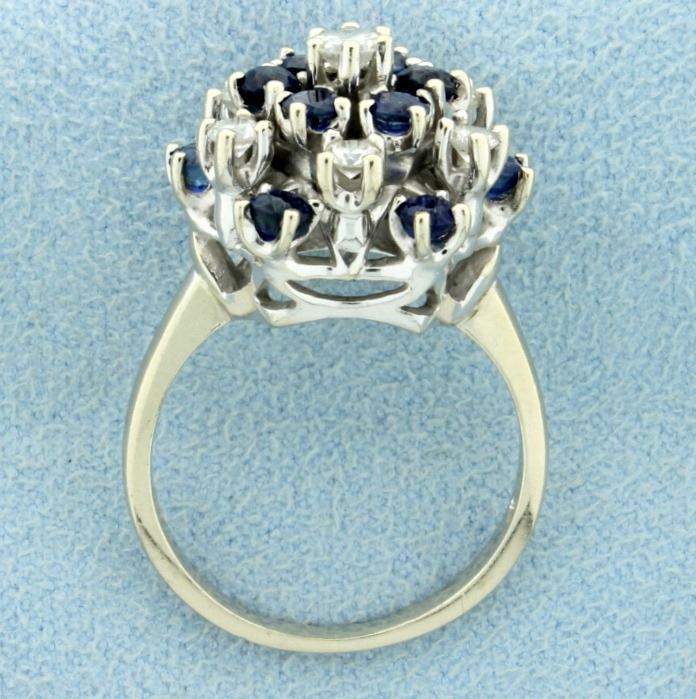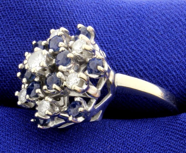 In 14K white gold. The center is a .20ct round diamond, surrounded by six .07ct round diamonds-all very high quality F color/SI clarity There are also twelve 3mm round natural sapphires (1.2ct total weight). Size 7 1/2 7.4g