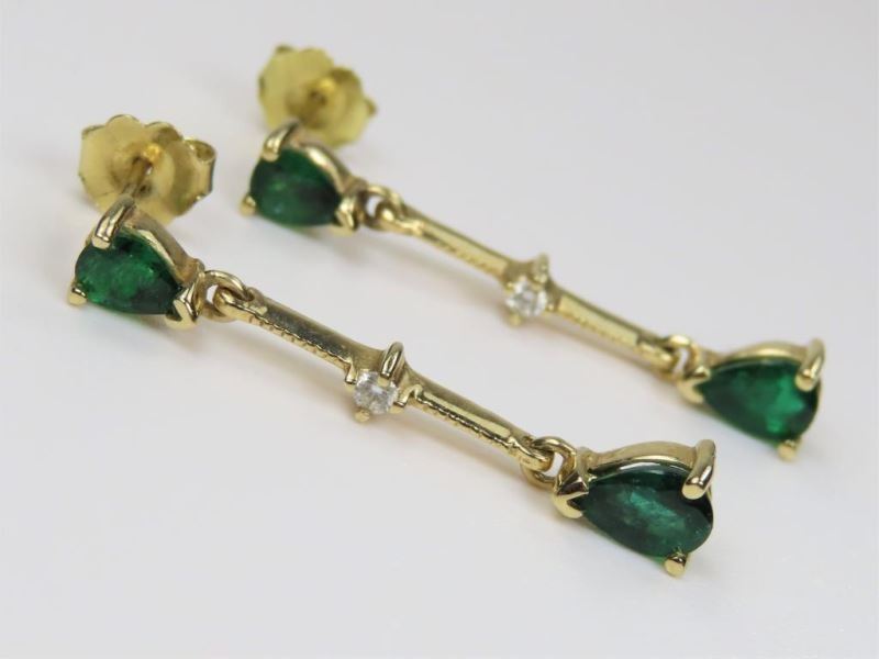 featuring 4 pear shaped Emeralds weighing approx. 2.00 carats with 2 small accent Diamonds set in 14 karat yellow gold drop settings.