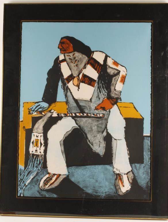 by top Santa Fe artist Fritz Scholder depicting Native American man seated. Image measures 22 1/2" x 30" with black mat and metal frame. Controversial and prolific, Scholder embraced paradox. An enrolled member of the Luiseno tribe, he often said he was not Indian. Scholder's works were immediately recognized for their insight and powerful commentary on publicly held stereotypes of Native Americans and propelled Scholder into a position of prominence as an artist. His revolutionary paintings broke away from stereotypical roles and forever changed the concept of "Indian artist". Scholder's constant desire to explore, collect, travel and experience is undoubtedly the distinguishing feature of both his life and his art. He is best known for his expressionist paintings that are in museum collections around the world. His style is well known for its distortions, explosive brushwork and vivid colors.