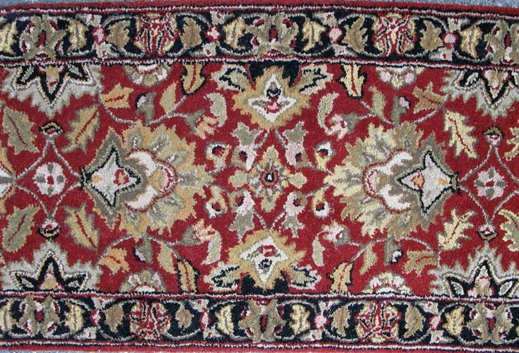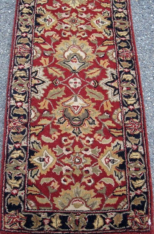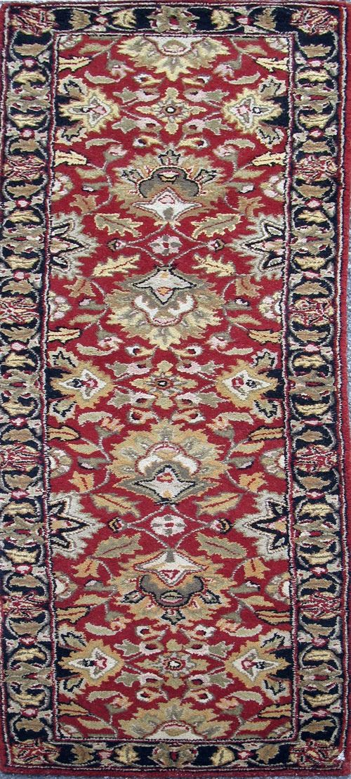 High Quality Lustrous Hand Made Meshg-Abad Design Runner. 100% Natural, vegetable dye, hand woven, hand spun, baby lambs wool pile on cotton foundation. This is a remarkable Runner with its most unusual floral Meshg-Abad design on a heartwarming ruby red background, Meshg-Abad Rugs are hand woven by semi-nomadic people. The central fields usually have a bold primitive floral pattern and the colors are warm, vivid and enchanting. This is a charming example of Meshg-Abad weave. Size: 8 feet X 2 feet 3 inches. Country of Origin: Tibet.