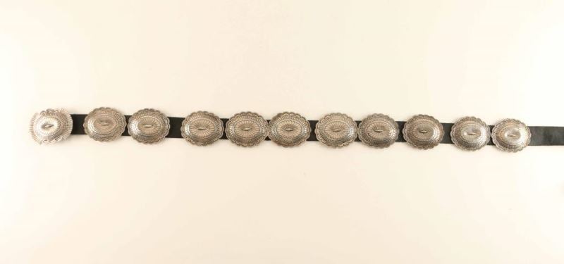 11 Conchos on Belt, unmarked, scalloped edge floral motif sterling silver conchos. Measure 2 1/2"x3".