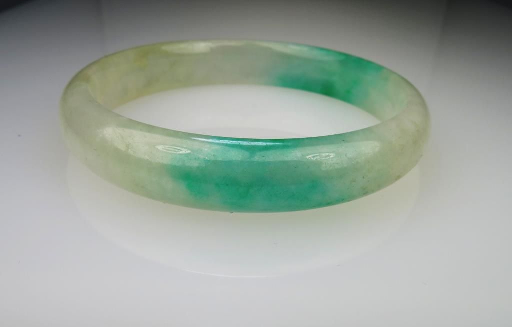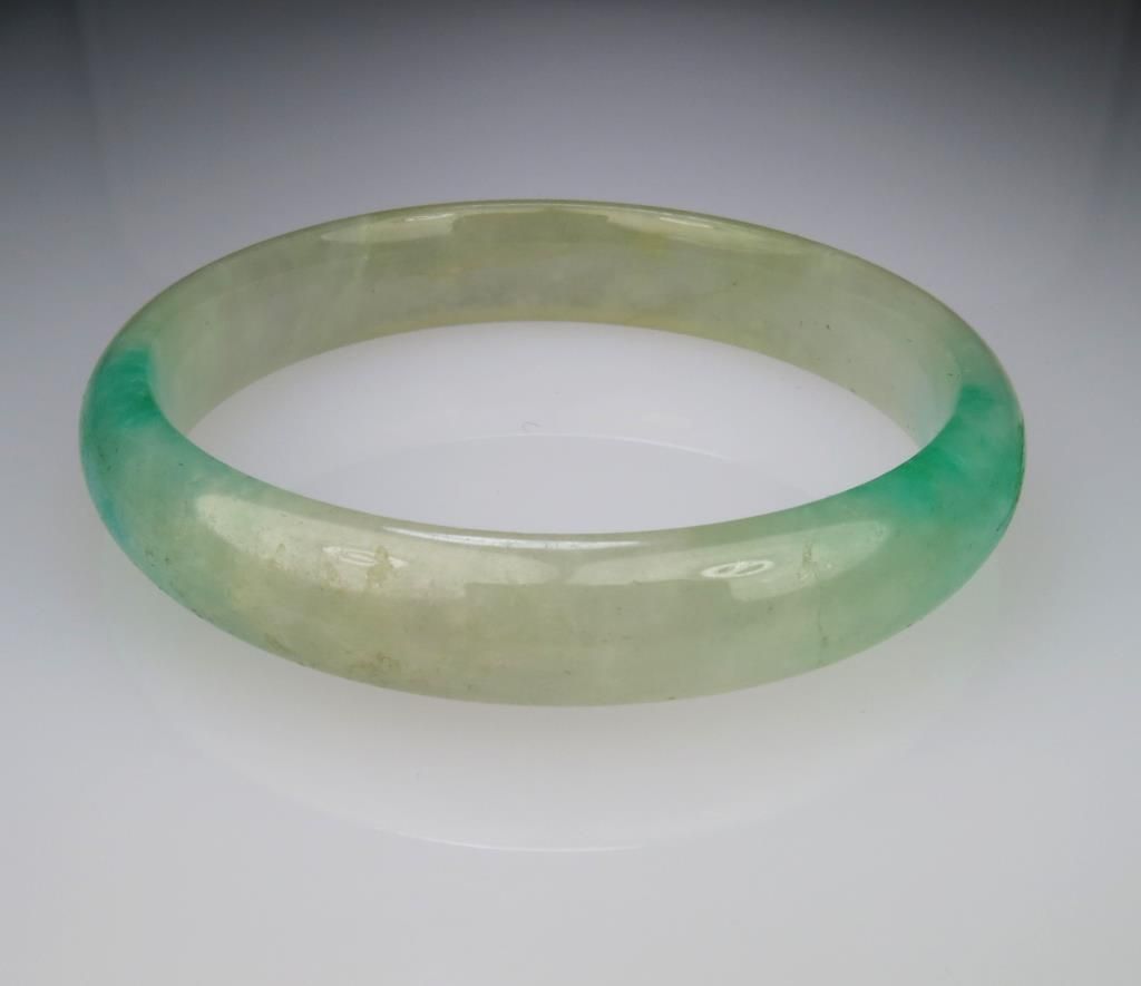 High Quality Natural Burmese Jade Bangle wonderful snow white and bright green colors with strong translucency, band width is over 12mm x 2.38 inch opening. Retail $1,000-$1,400 Estimate $600-$900.