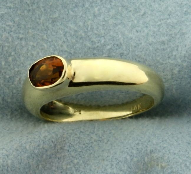In 14k yellow gold, containing a 6x4mm oval citrine gemstone with desirable orange color with flashes of red. Size 4. 3.5g.