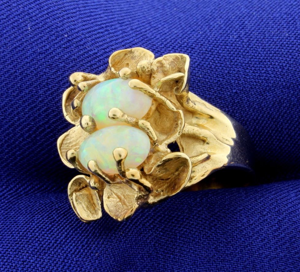 In 14K yellow gold, this ring contains two very high quality 10mm oval opals with significant color of play! Size 8 11.5g