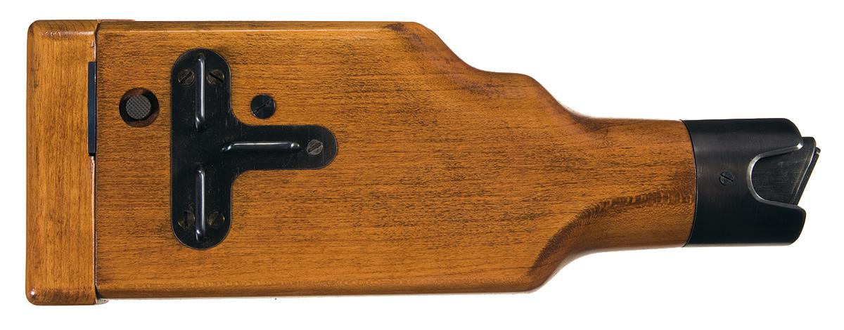 Contemporary production, with the original methods reproduced to make the stock as close to vintage as possible. Cherry wood construction, with orange stain and shellac finish for proper color, outfitted with rust blue components, 2-position telescoping neck with spring loaded latch, niter blue screws and small parts, and hinged lid with green felt pad. Inside the stock is an unmarked bright steel cleaning rod. With a red velveteen pouch.