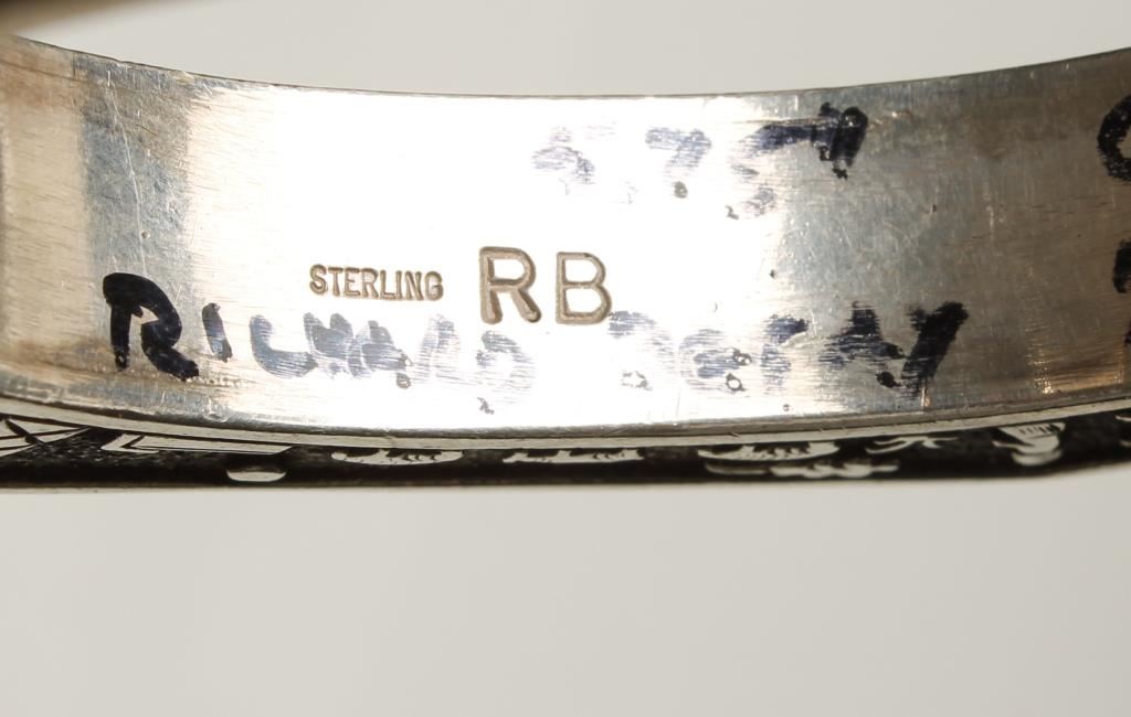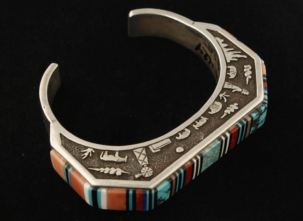 With beautiful inlaid turquoise, onyx, lapis, coral, and white buffalo turquoise. The detail on the sides is wonderful with farming scenes, set in sterling silver, Signed "RB" by noted silversmith Richard Begay.