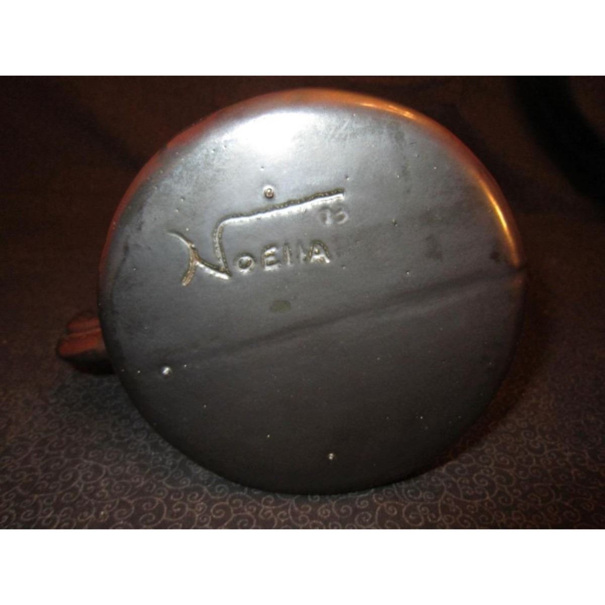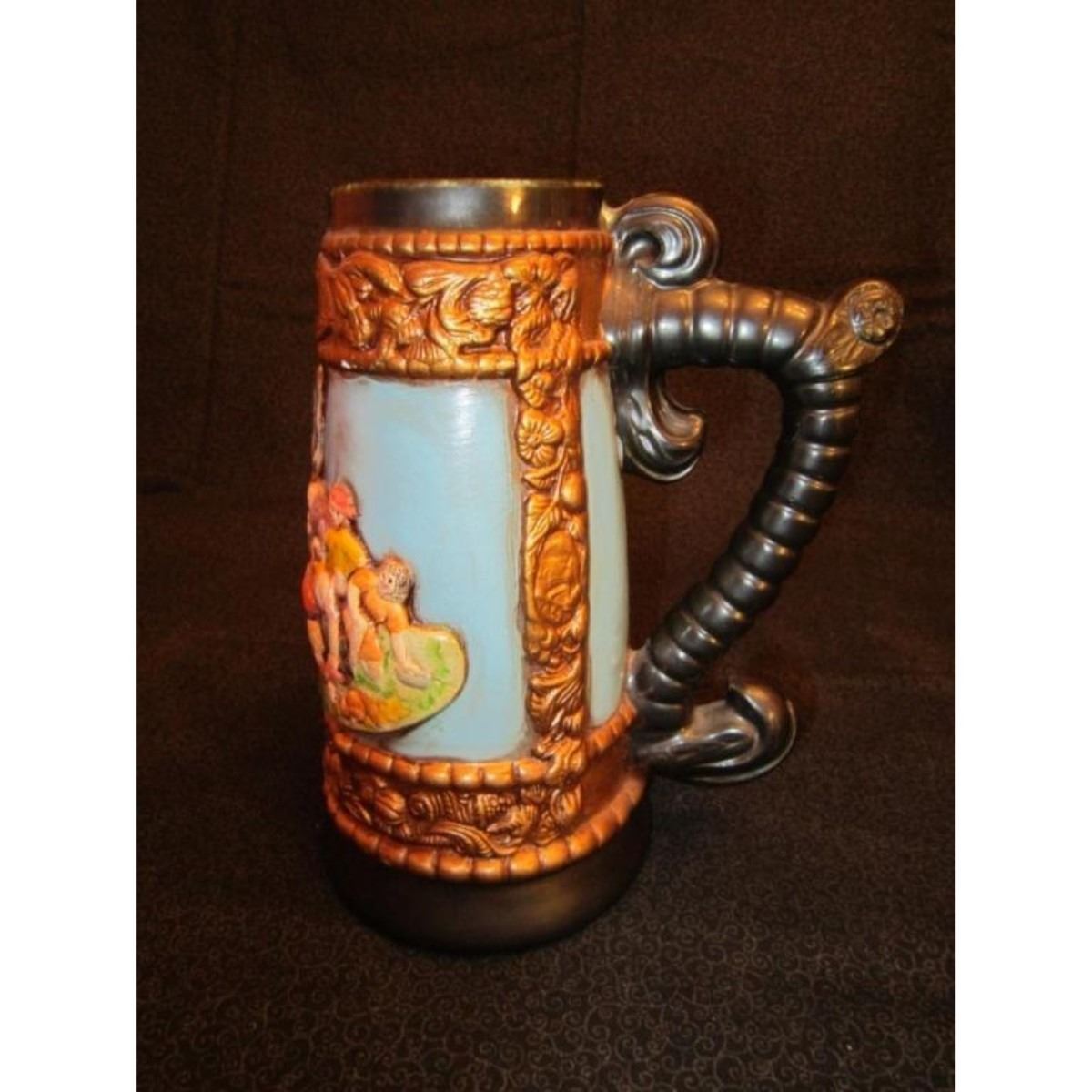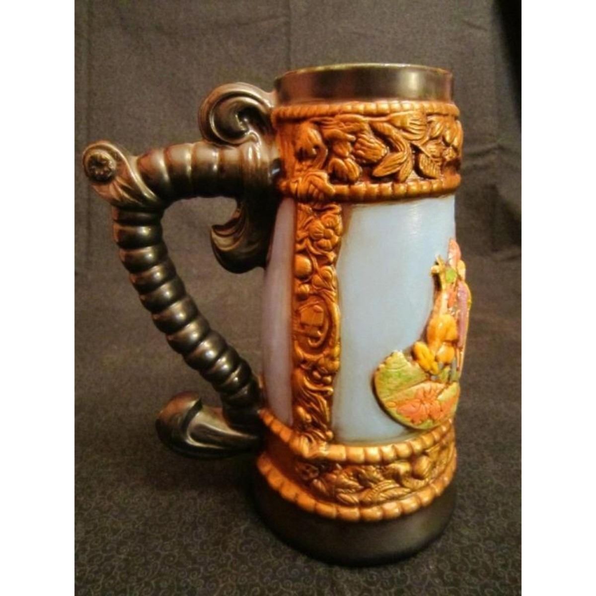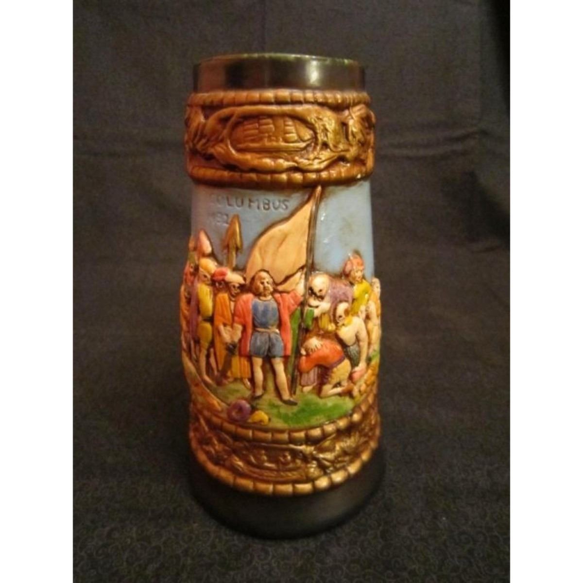 High relief Columbus ceramic beer stein, measuring approximately 8 1/4" H X 4 1/2" at its base. It features a scene of Columbus carrying a flag inscribed "Columbus 1492." Signed Noella.