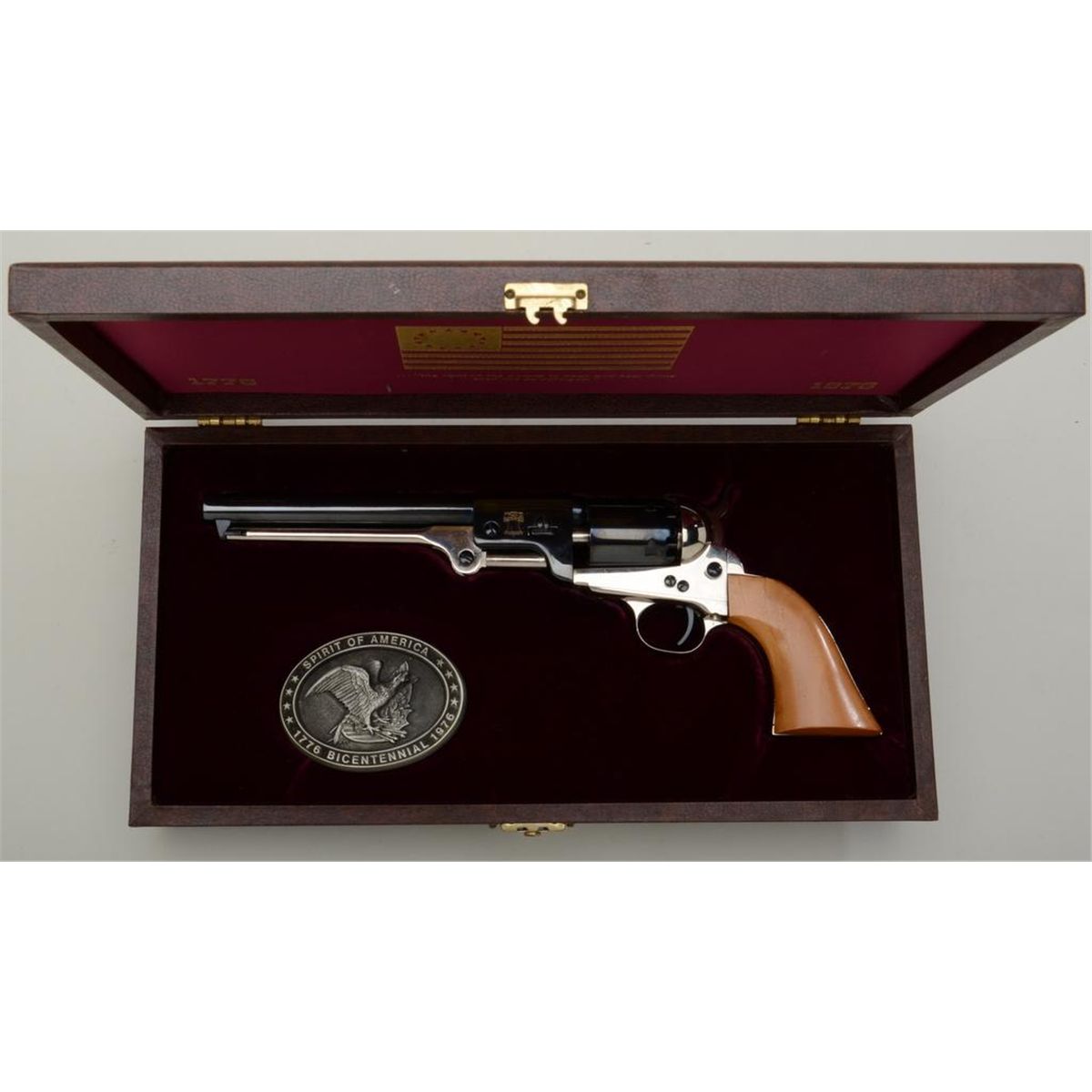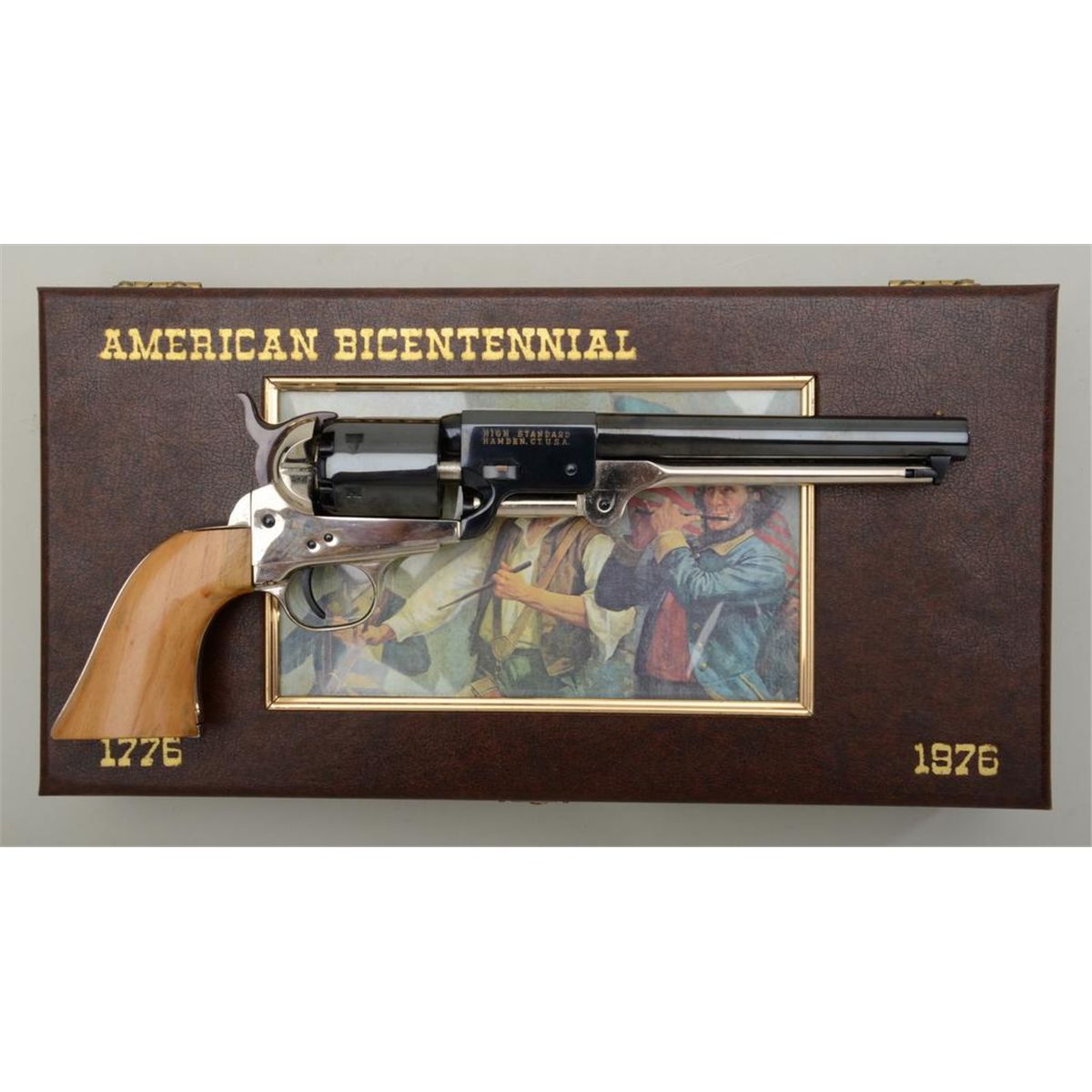 High Standard American BiCentennial percussion revolver in factory display case with medallion and factory shipping box with sleeve numbered to this gun, .36 cal., 7-1/2” barrel, black and nickel finish, wood grips, #A1335. This modern commemorative gun is in overall like new condition showing little handling; the presentation case is also excellent and the shipping box and sleeve are in very good condition. Est.: $175-$350.
